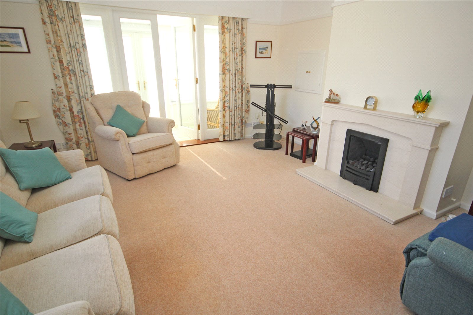 A lovely bright double aspect room with double glazed window to side, further double opening doors to: