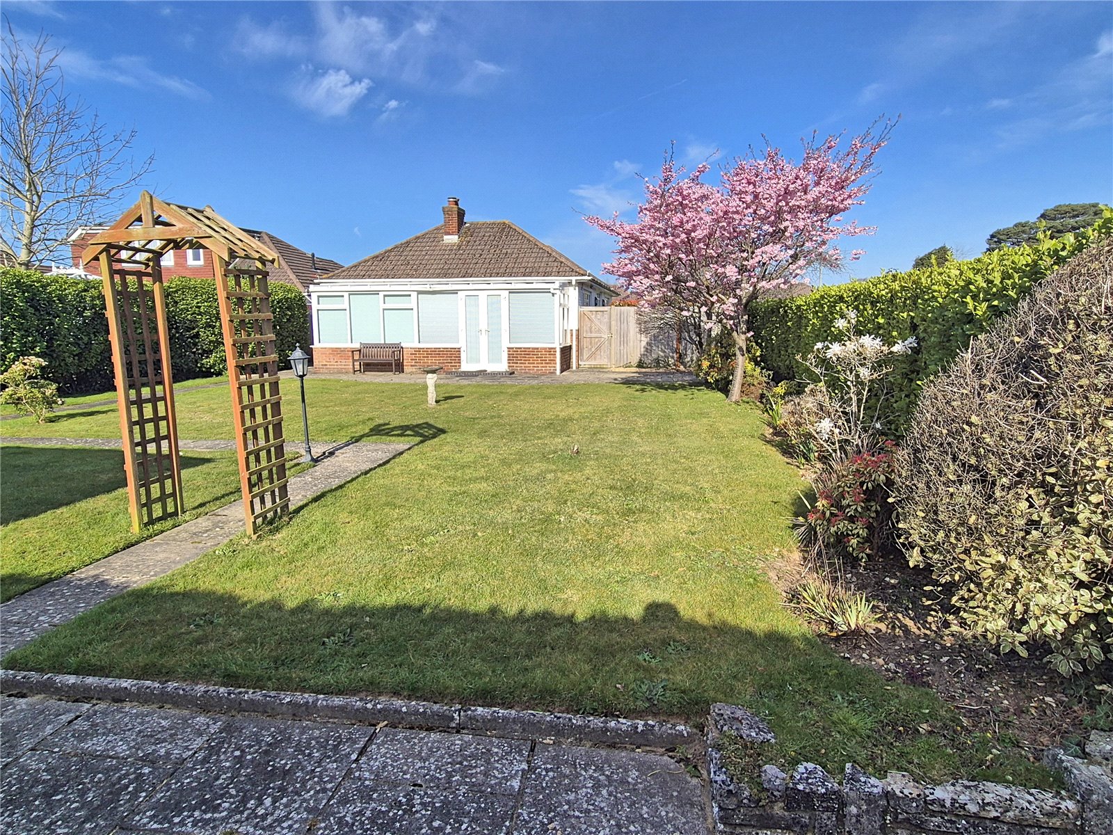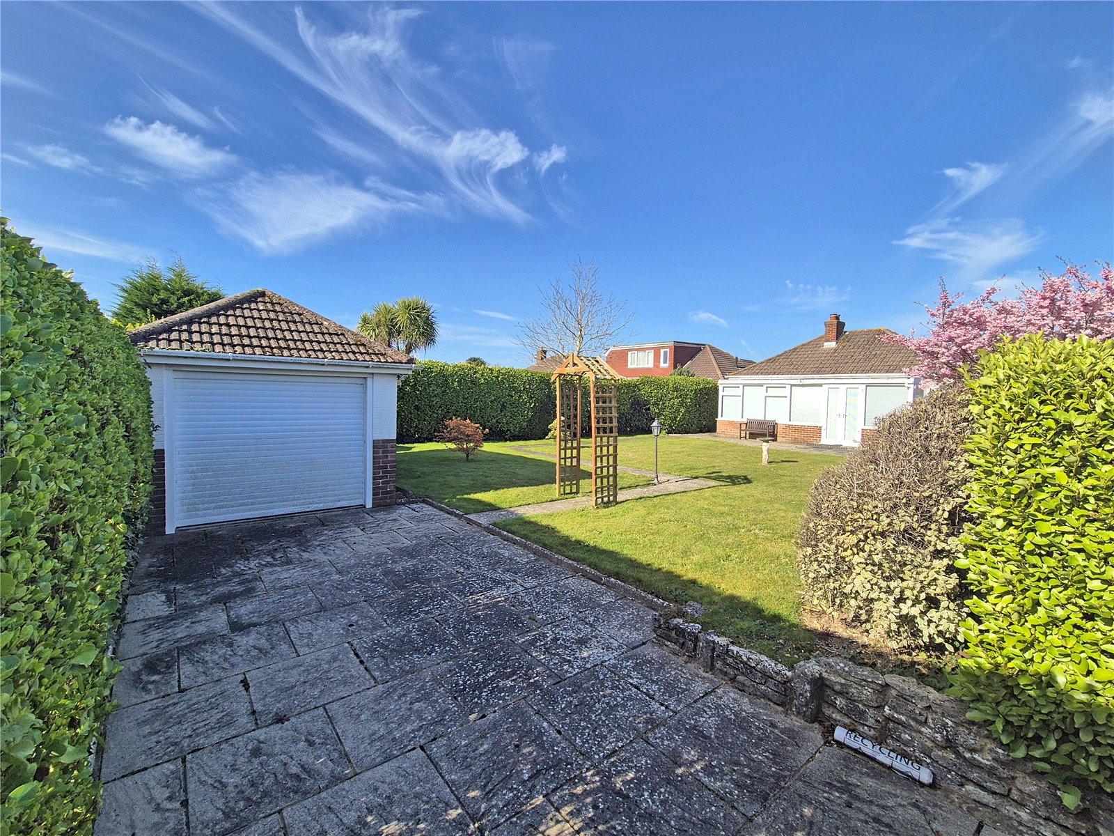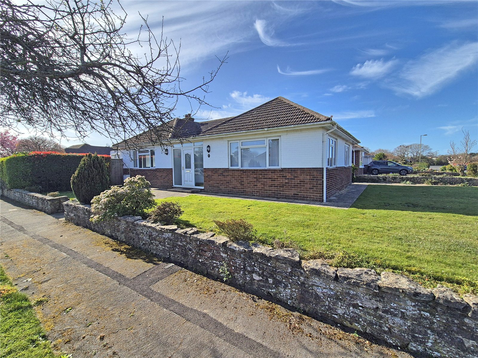 The property sits on an extremely well tended corner plot with good sized area of lawn to the front and side of the property, enclosed by walling with paved pathways, shrubs and hedging. Pedestrian side access gates give access to the rear garden. Double opening gates to the rear, provide access to the driveway, providing off road parking and in turn leading to: