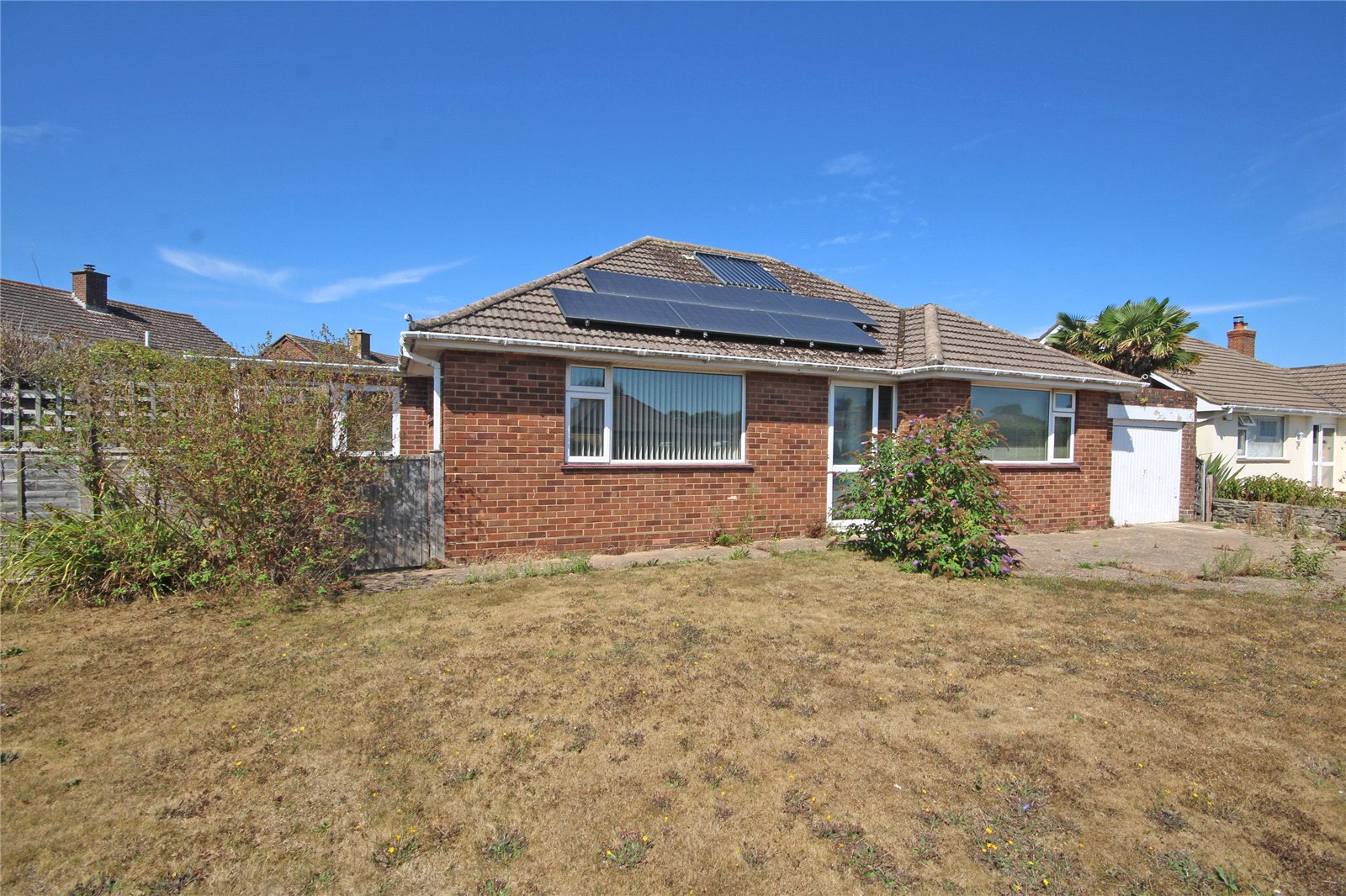 The property has a good sized frontage, bordered by low walling, laid predominately to lawn with mature shrubbery. Paved driveway provides off road parking and leads to: