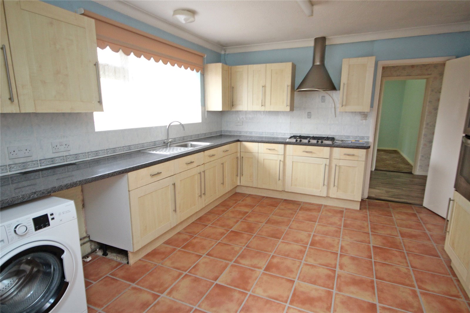 Being part tiled comprising single bowl single drainer sink unit with mixer tap, range of work surfaces with drawers and cupboards below, inset five ring gas hob with extractor hood over, further built in double oven, space and plumbing for washing machine, cupboard housing Baxi gas fired central heating boiler, further matching storage cupboards, built in airing cupboard, windows to rear, door to:
