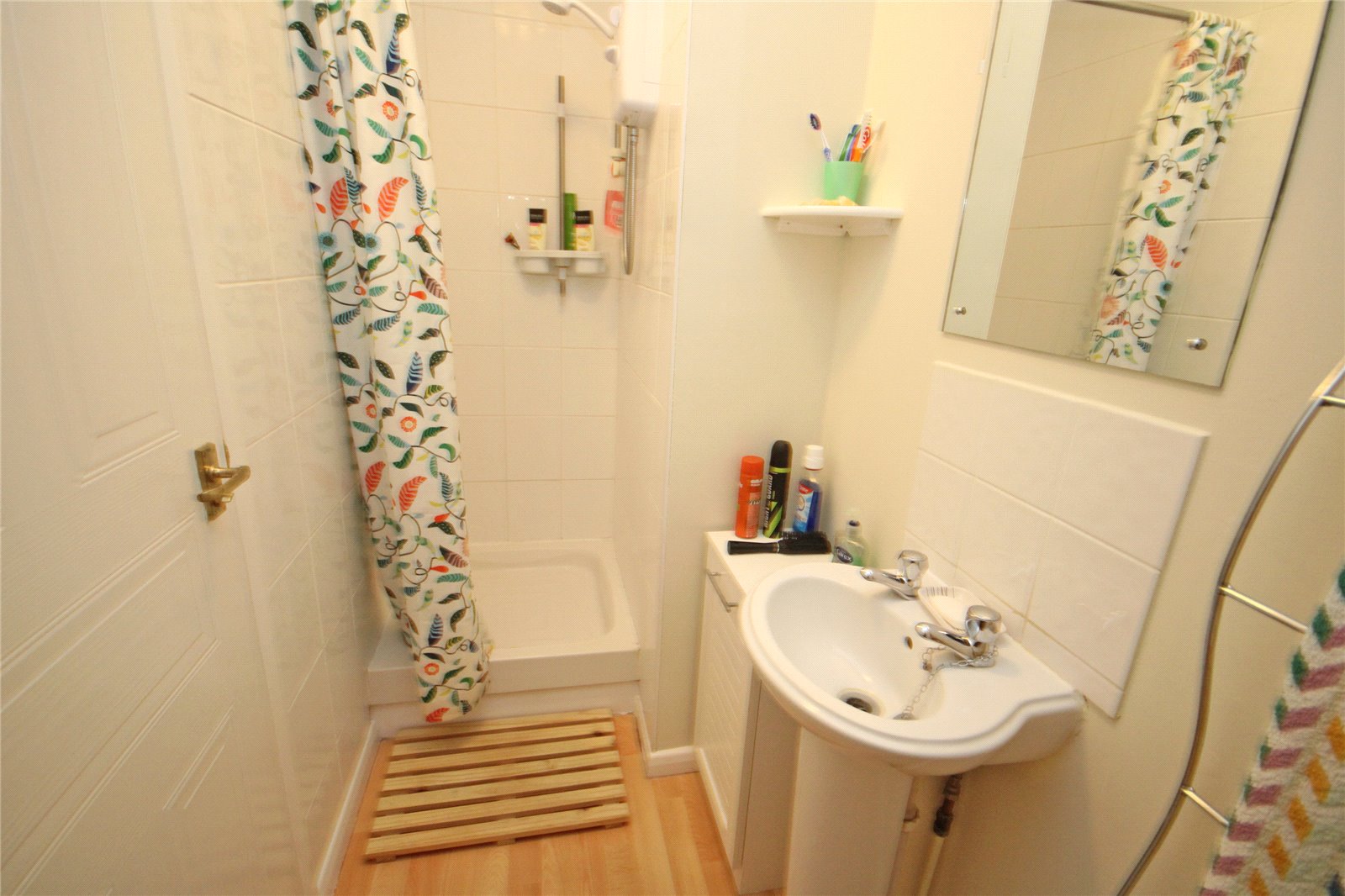 Comprising inset wash hand basin with storage cupboard below, low level w.c., bath, electric heater, window to side.