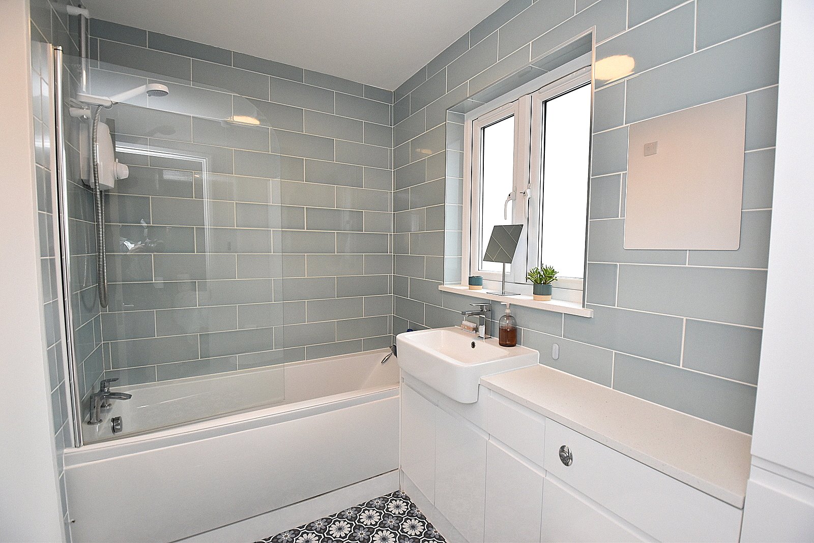 FAMILY BATHROOM: A stylish suite comprising fitted units incorporating wash basin, WC with concealed cistern and storage units. Bath with Aqualisa power shower over, shower screen, heated towel rail, tiled to splash prone areas, smooth plastered ceiling with extractor, and double glazed window to side aspect.