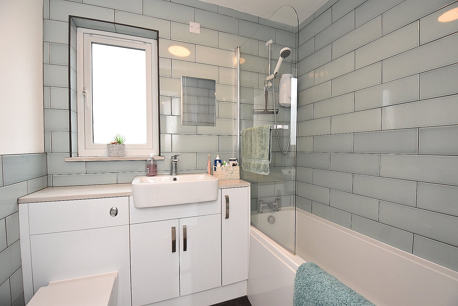 EN-SUITE BATHROOM: A stylish suite comprising fitted units incorporating wash basin, WC with concealed cistern and storage units. Bath with Aqualisa power shower over, shower screen, heated towel rail, tiled to splash prone areas, smooth plastered ceiling with extractor and double glazed window to front aspect.