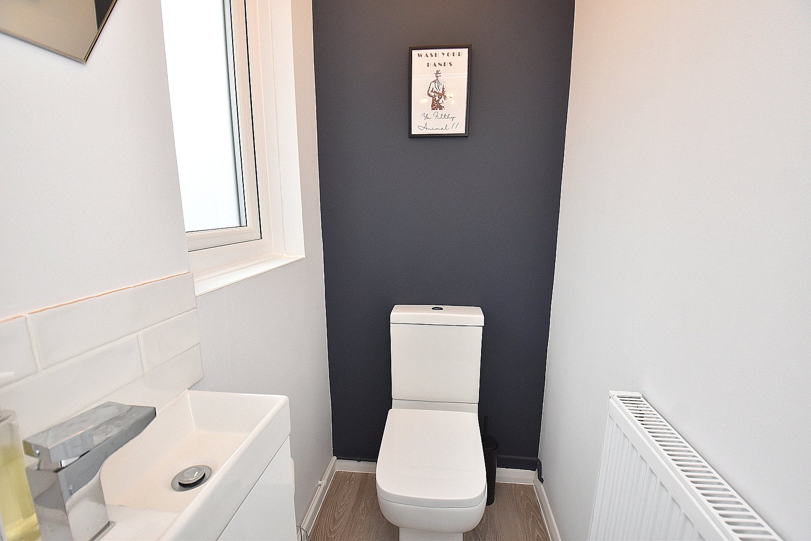 CLOAKROOM: New suite fitted during 2025 with wash basin unit, low level WC, radiator, double glazed window to side aspect and smooth plastered ceiling.