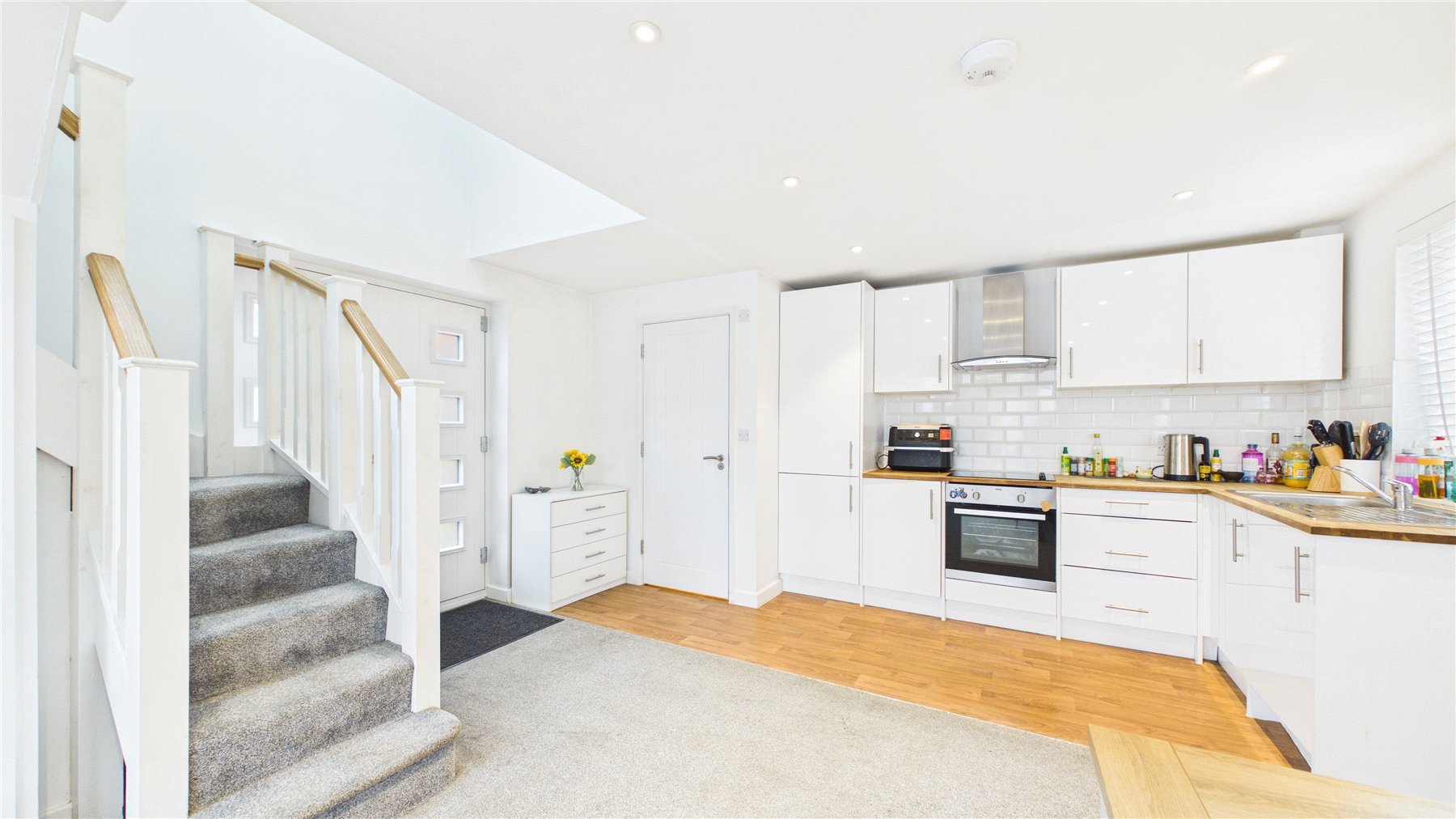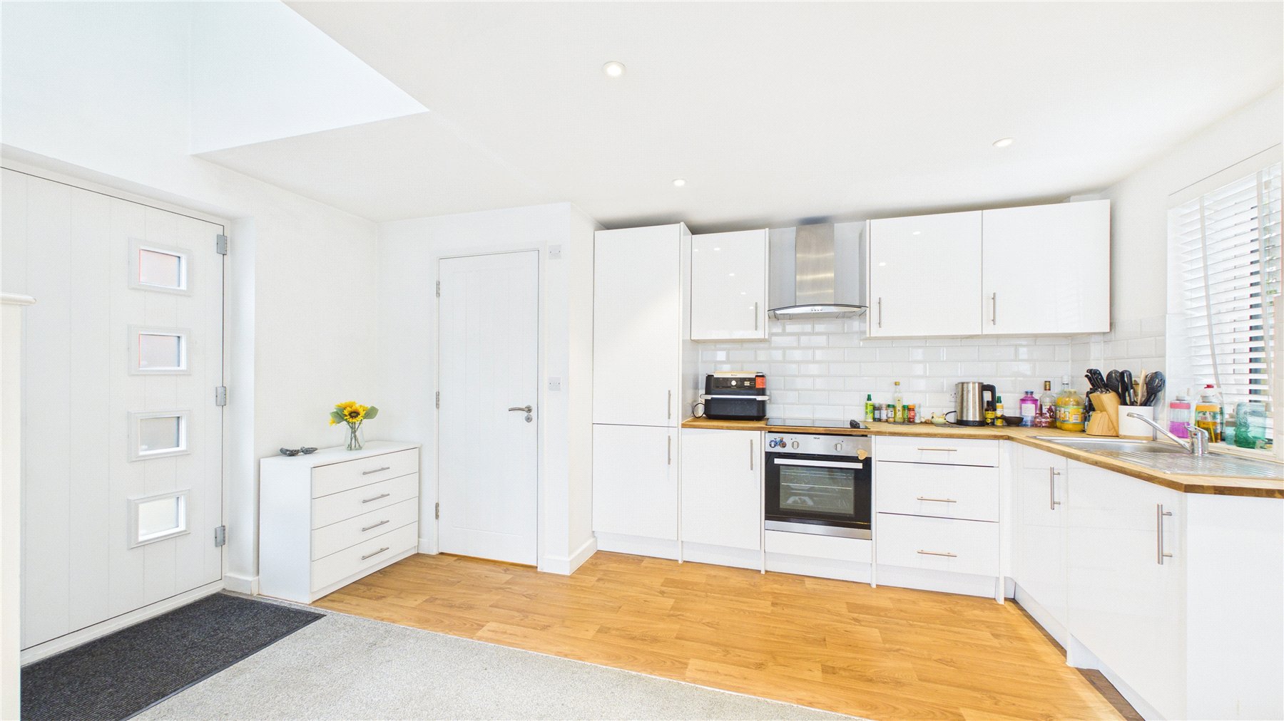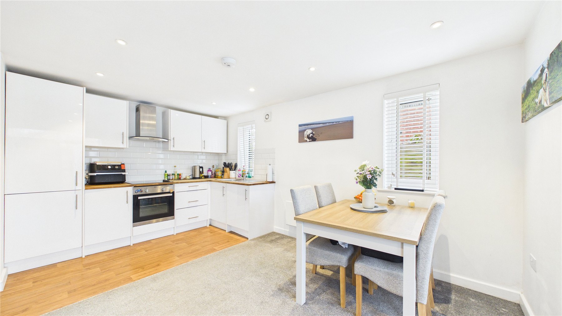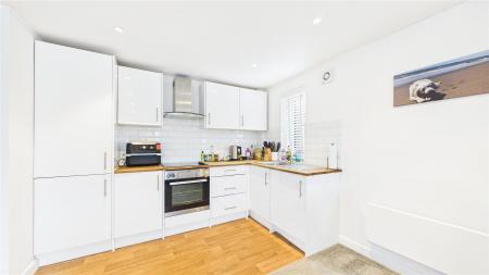 The kitchen/dining room is fitted with a range of sleek white wall and base units with wooden work surfaces, integrated oven and hob, and ample space for appliances. The open-plan layout creates a sociable environment ideal for modern living. The property further benefits from a handy WC.
