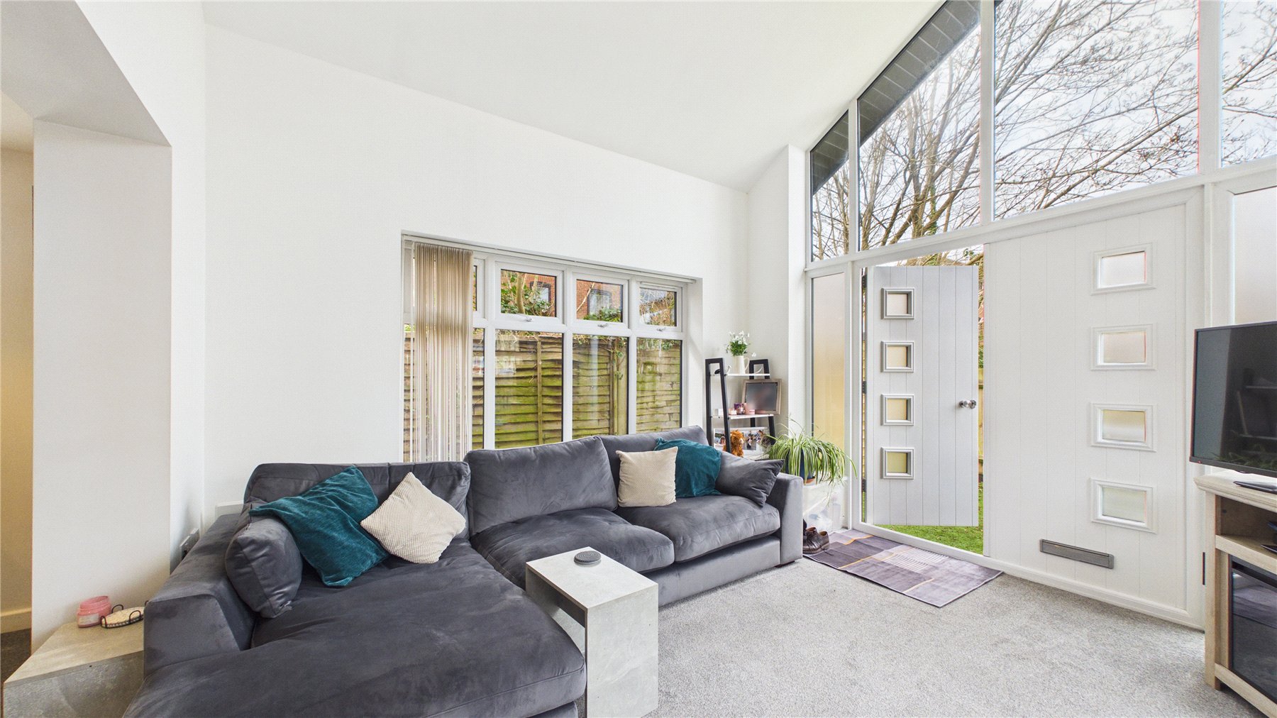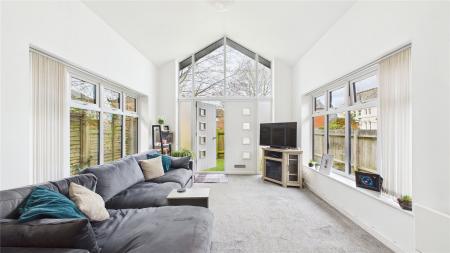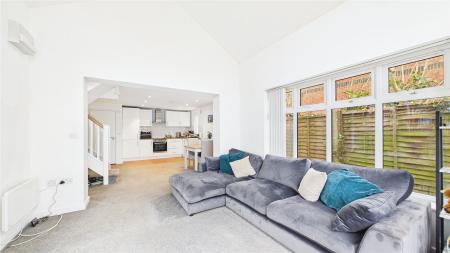 The property features an impressive open-plan ground floor living space with striking high ceilings and large glazed panels that flood the room with natural light. The living area provides a comfortable space for relaxing and entertaining, complemented by large windows.