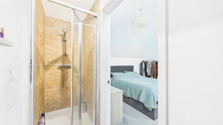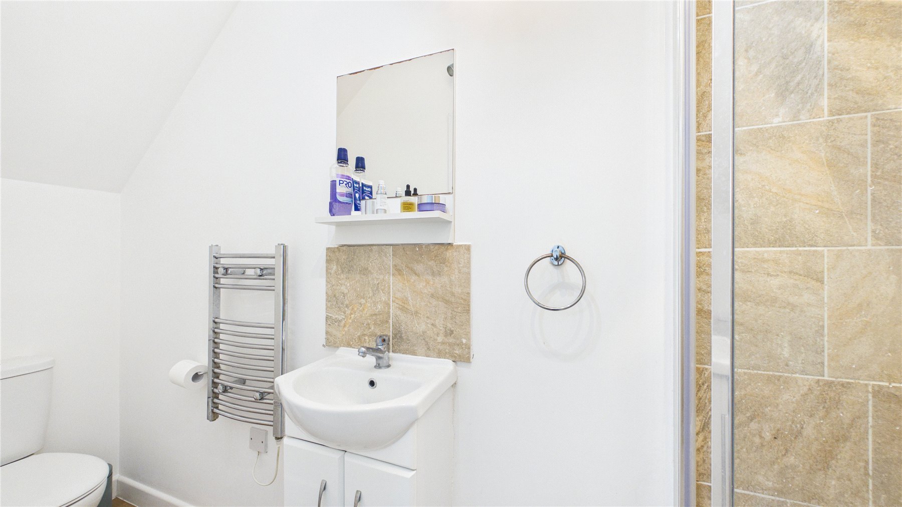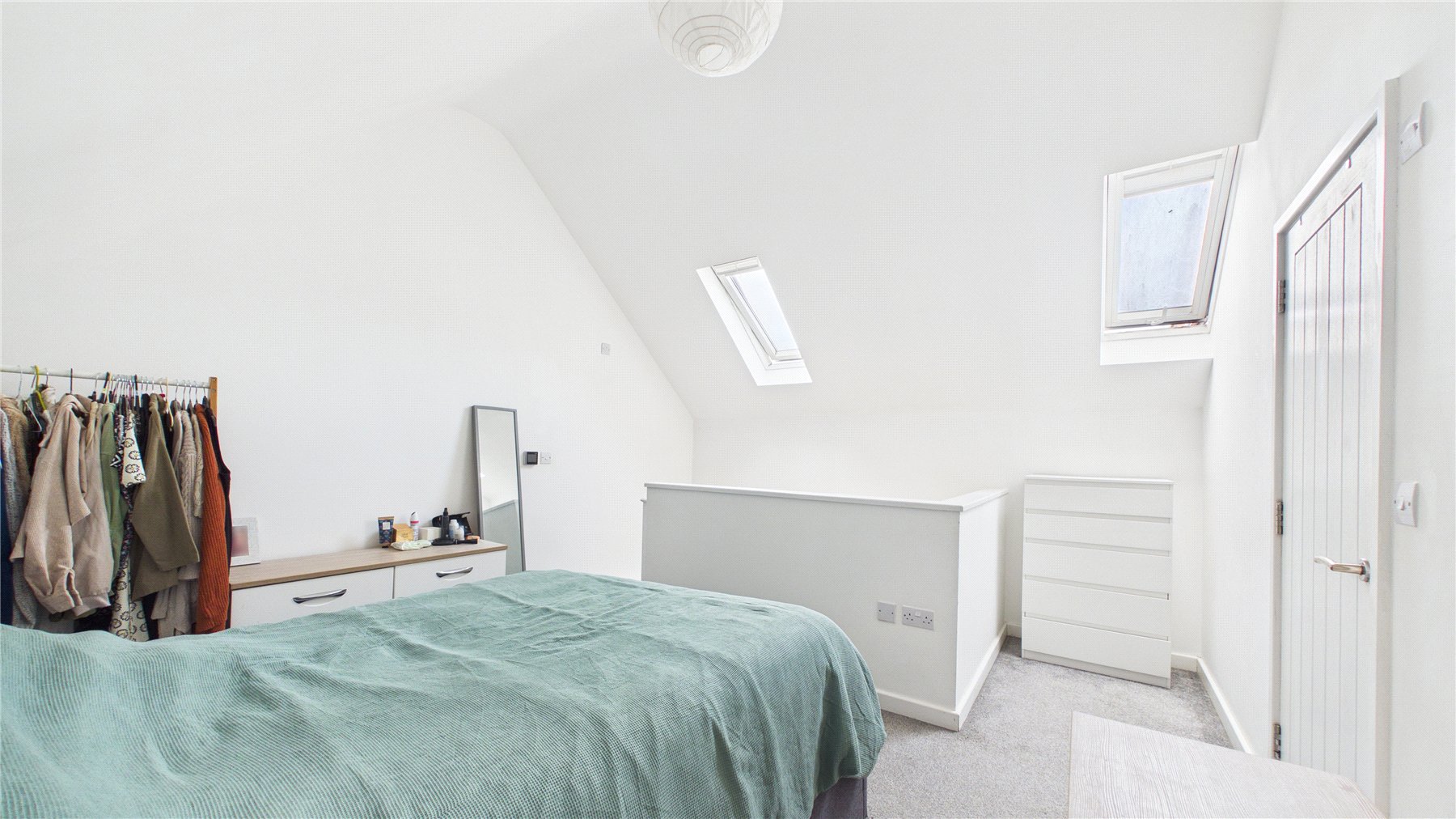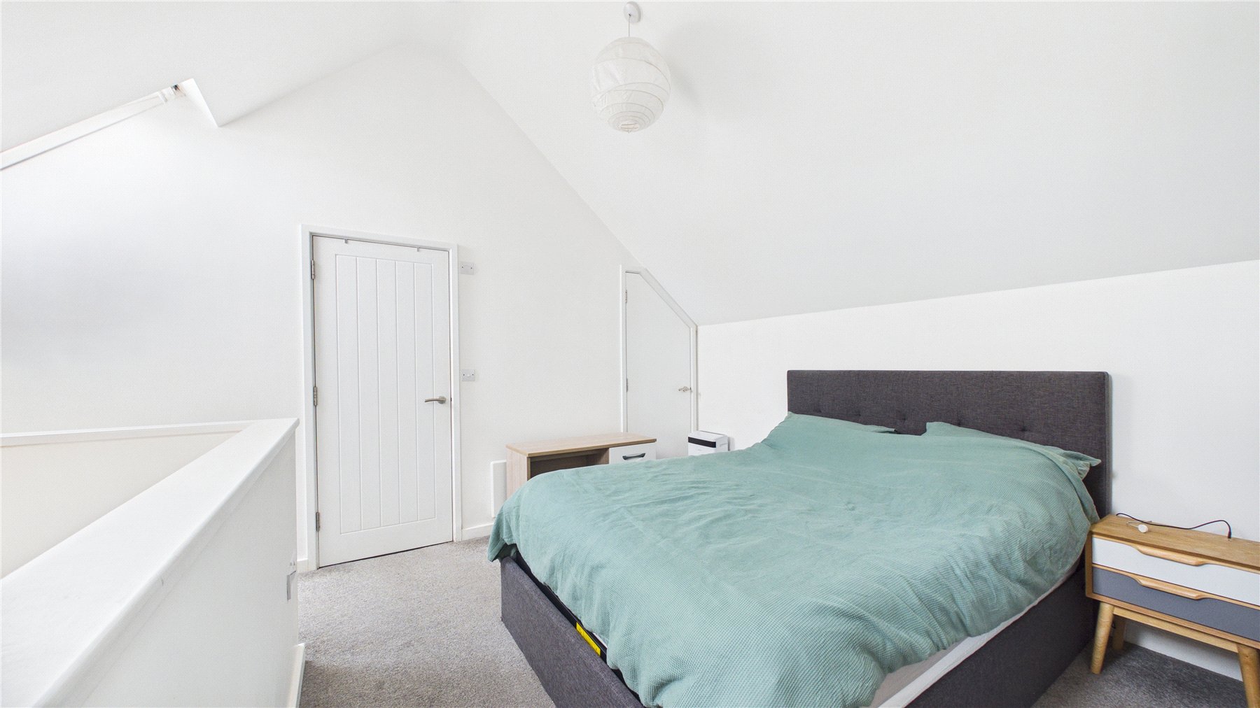 Upstairs, the generous double bedroom offers excellent proportions and space for wardrobes or additional furniture. The bathroom is fitted with a modern white suite including bath with shower, wash basin, and WC.