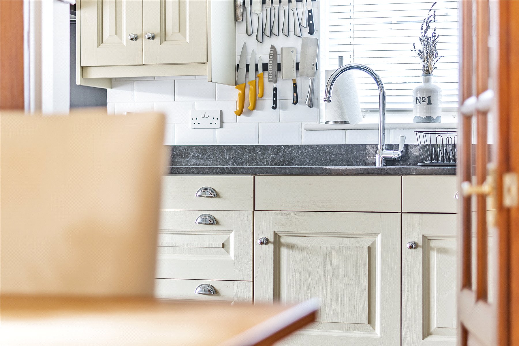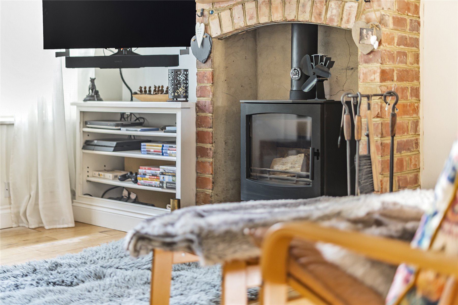 The main reception area features an attractive wooden floor and a brick fireplace with a wood burner, and is open-plan to the kitchen, which boasts a range of quality units and granite countertops. The kitchen seamlessly connects to the breakfast/dining area, which includes additional concealed storage, a ground floor cloakroom, and double-glazed doors that open onto the south-facing garden.