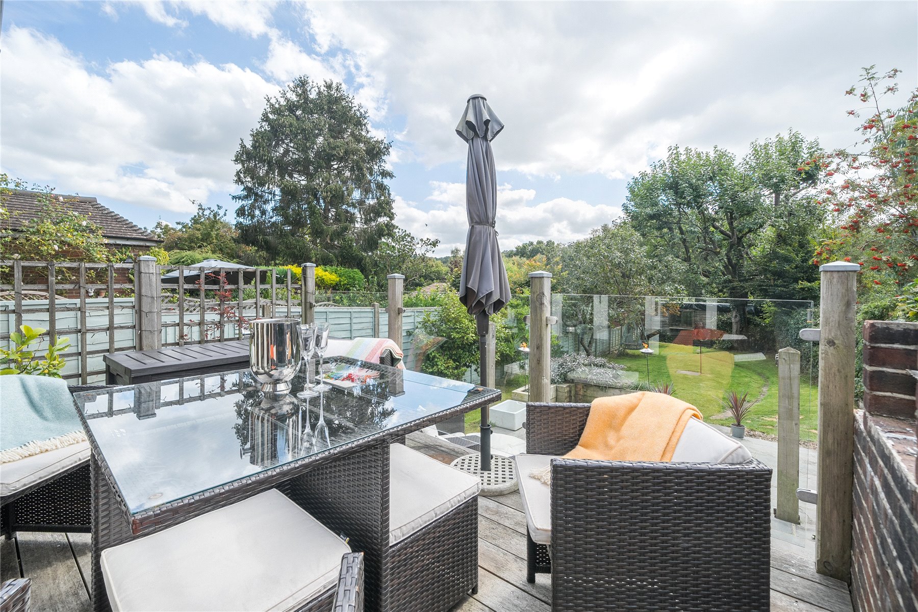Outside, the front of the property features a shingle driveway with off-street parking for two cars, along with a log store. A paved side path leads to the rear garden, where you'll find a raised wooden decked terrace, a brick-built BBQ area, and a wooden and glass balustrade with steps descending to the lower garden. The garden includes a natural stone paved terrace, raised wooden beds, a lawn, panelled fencing, and a wooden garden shed at the far end.