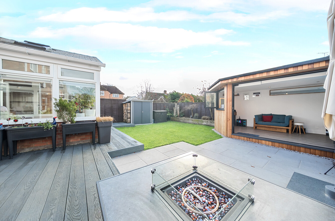 The gardens are level and sunny, enjoying sun throughout the afternoon and into the evening. They have been considerately landscaped to offer a spacious and pleasant, low maintenance area, which maximises the potential for relaxation and entertaining. Extending away from the conservatory and kitchen is hardwearing composite decking, leading to a lawn to the left and a paved patio to the right. To the end of the lawn is a raised sleeper bed; ideal for both flowers and vegetables depending upon the type of gardener you are. To the far corner is a superb garden office/studio. A great space to work from home, create a gym, hobby room, teenage den, or create a lounge/bar to complement the patio area and offer a seamless entertaining area whatever the weather. The studio benefits from a bi-fold window, bi-fold doors with remote control blinds, electric heating and broadband connection.