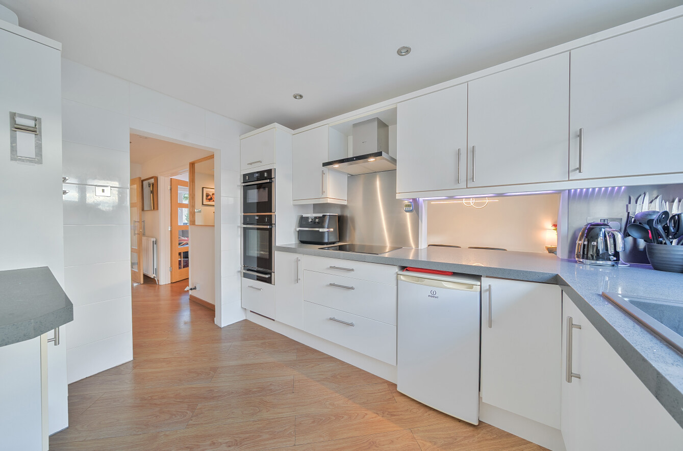A modern fitted kitchen also overlooks the garden, with a double window opening up to allow you to enjoy the outdoors whilst inside. Alongside drawer and cupboard storage are integrated appliances including a double oven/micro/grill, hob and dishwasher plus bin store and pull out pantry and breakfast bar.