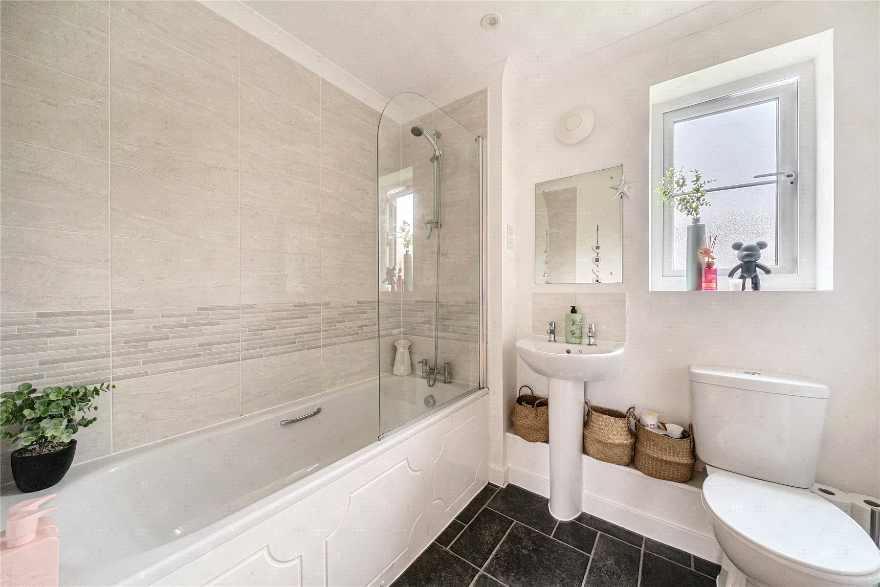 The apartment features two well-proportioned bedrooms. The main bedroom is spacious and tastefully decorated, while the second bedroom is ideal as a child's room, guest bedroom or home office. A modern family bathroom completes the accommodation, fitted with a white suite and shower over bath.