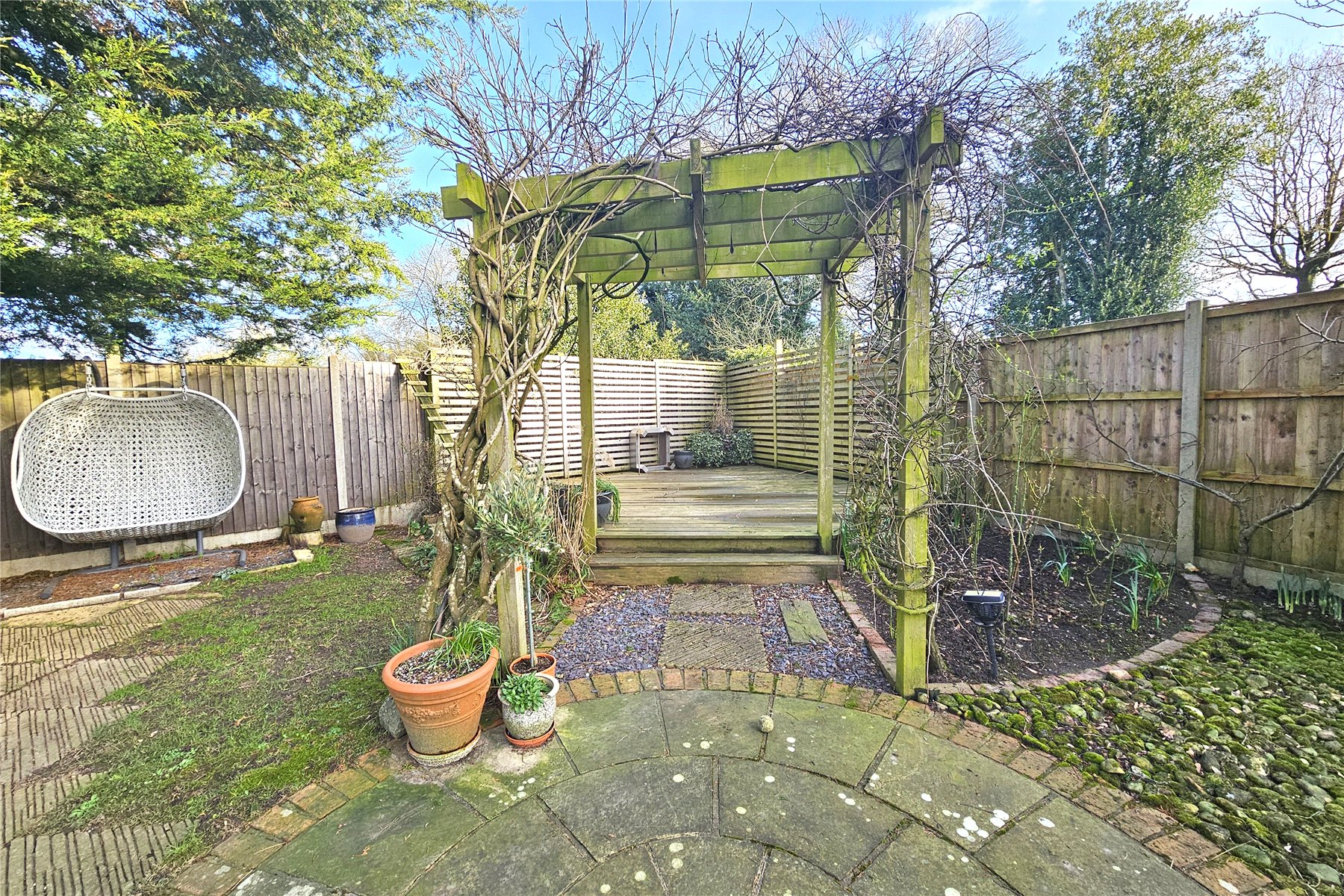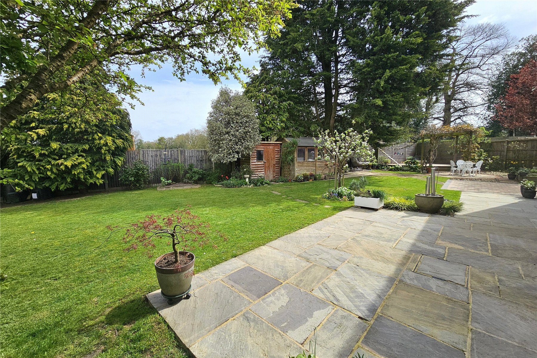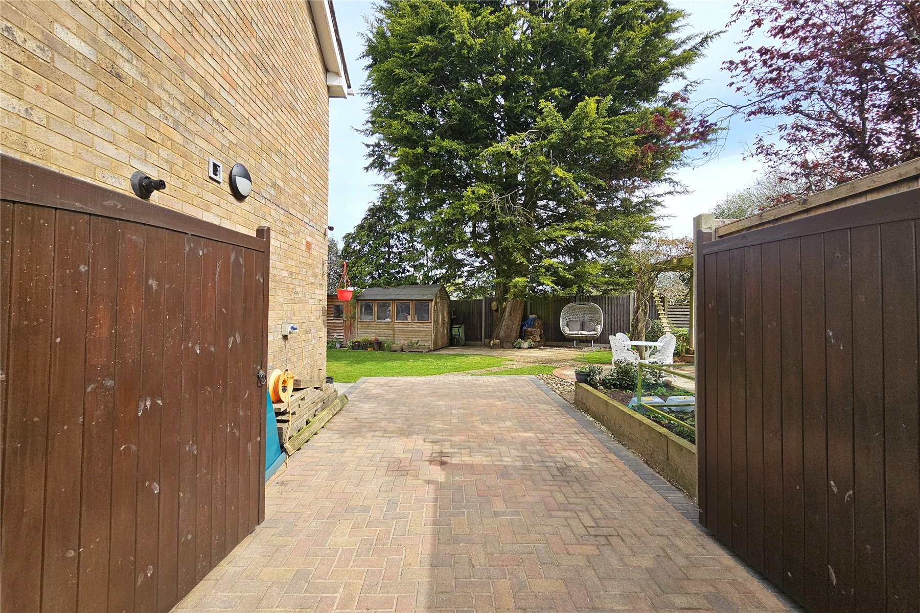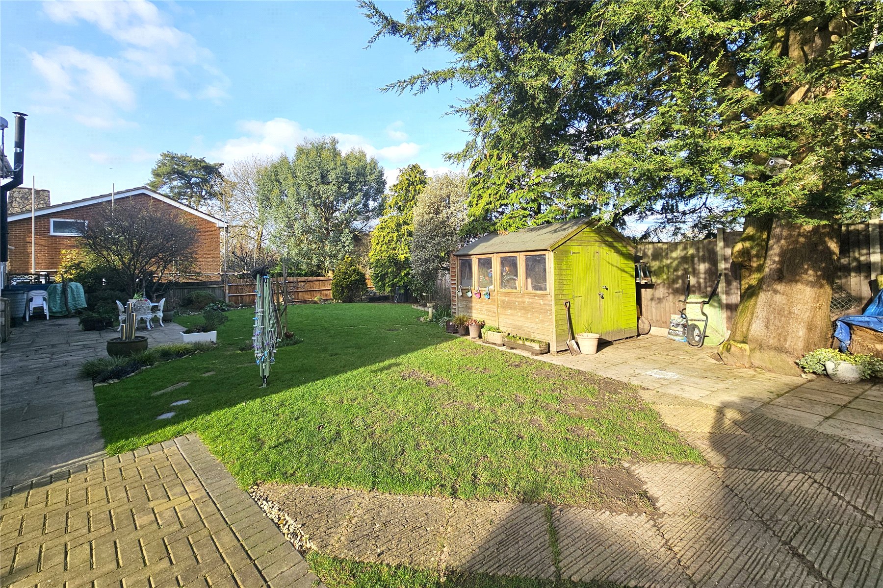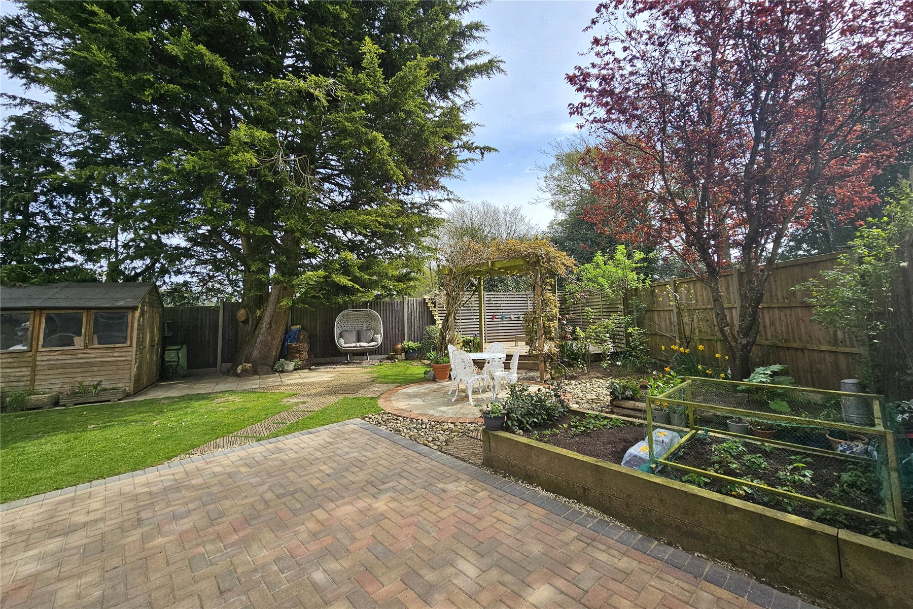 The garden to the rear is level and enclosed with plenty of space for family activities. There are two patio area, a paved terrace adjacent to the house and a paved circular patio and pergola covered raised decked area tucked away to the far end, which is perfect for capturing the evening sun. The remainder of the garden is predominantly laid to lawn with mature trees and shrubs to the borders in attrition to a couple of raised vegetable beds. There are also two useful garden sheds. Finally, there are double gates from the garden onto the driveway meaning additional vehicles can come into the garden if needed, with a hardstanding area available.