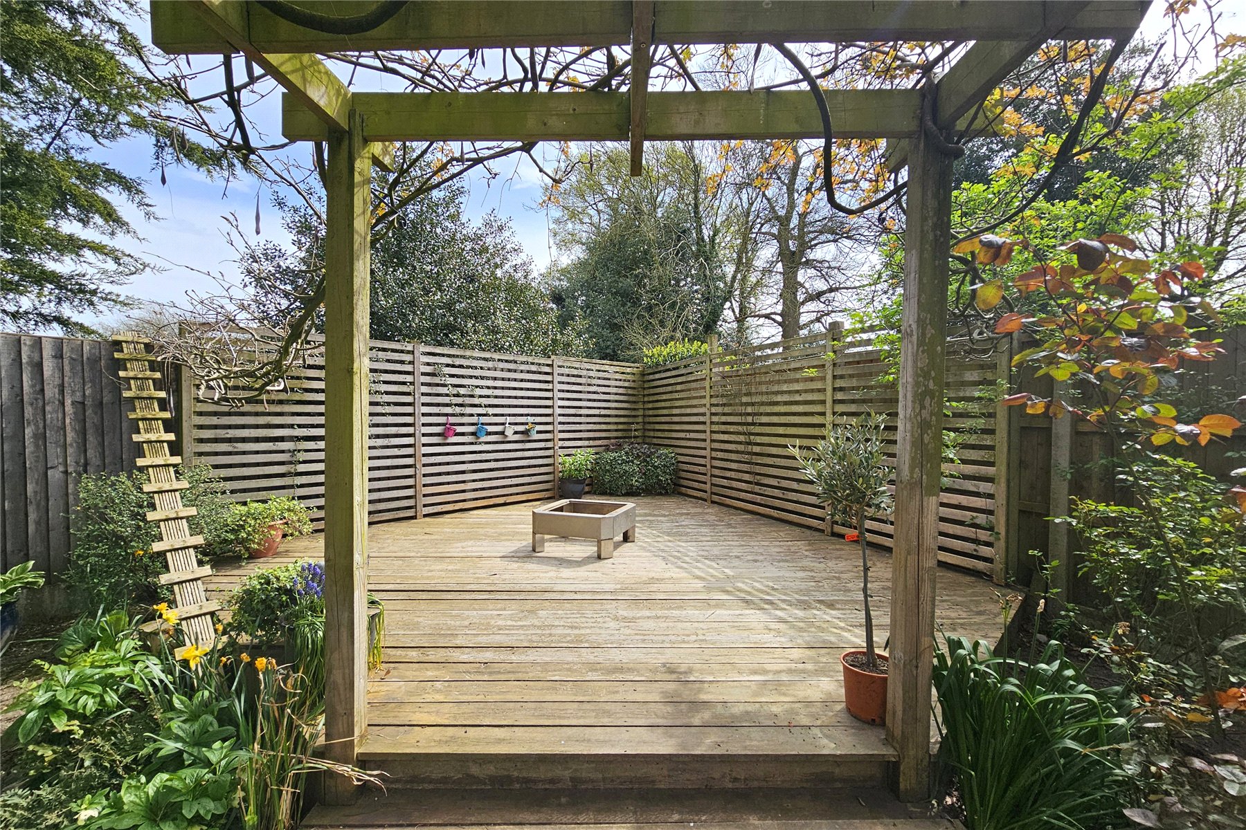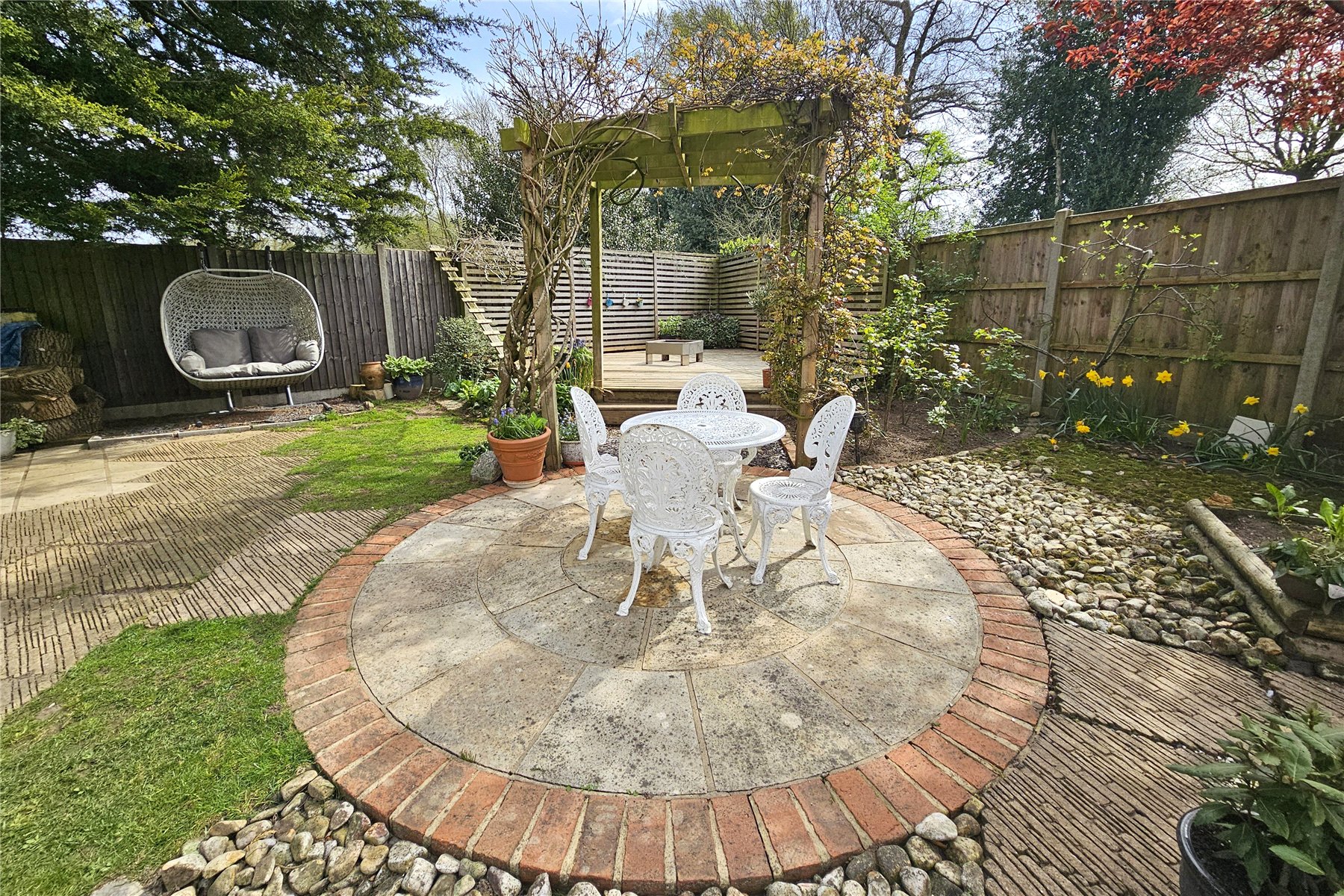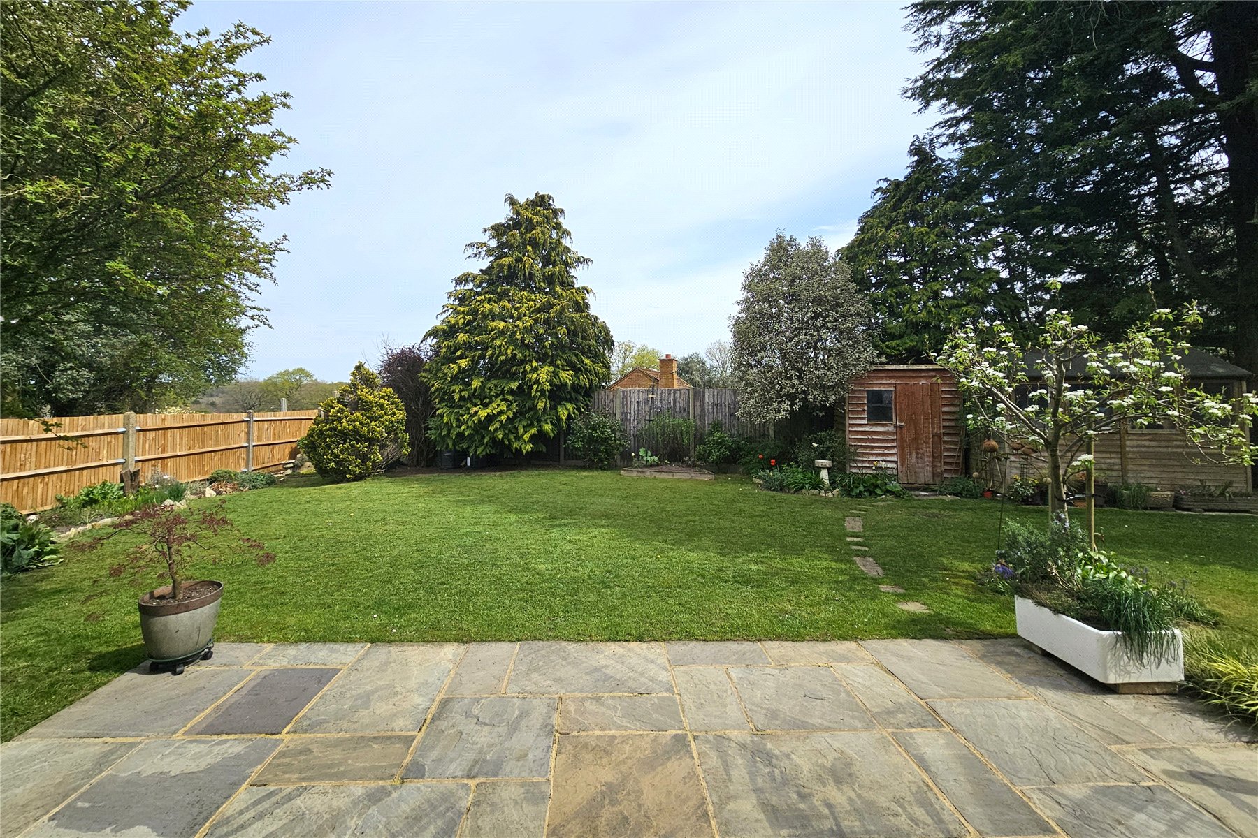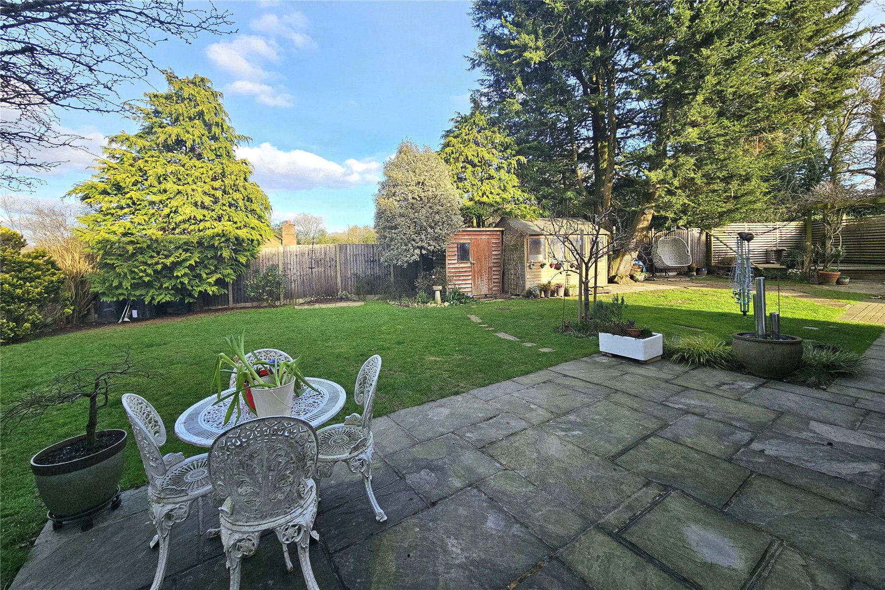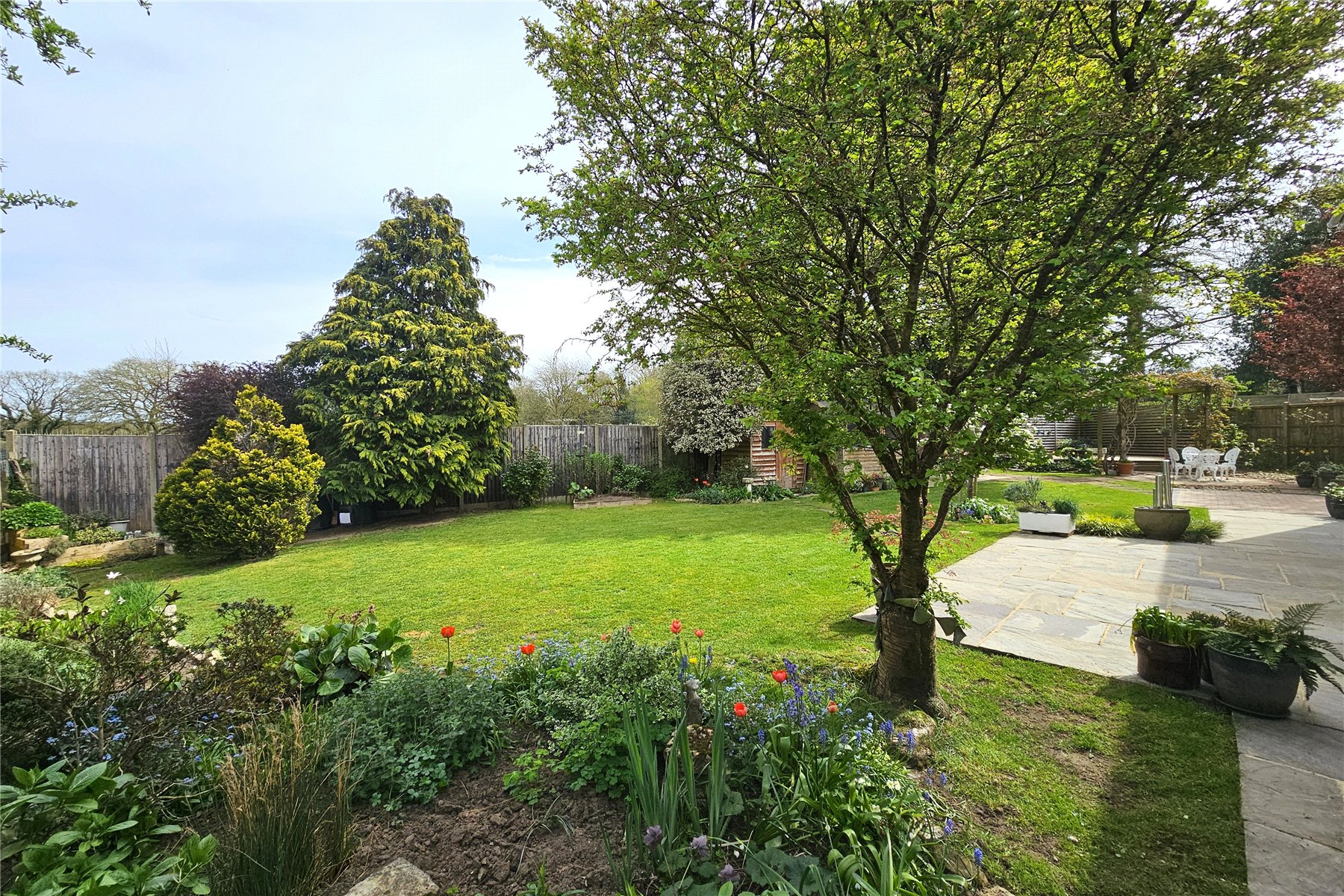The garden to the rear is level and enclosed with plenty of space for family activities. There are two patio area, a paved terrace adjacent to the house and a paved circular patio and pergola covered raised decked area tucked away to the far end, which is perfect for capturing the evening sun. The remainder of the garden is predominantly laid to lawn with mature trees and shrubs to the borders in attrition to a couple of raised vegetable beds. There are also two useful garden sheds. Finally, there are double gates from the garden onto the driveway meaning additional vehicles can come into the garden if needed, with a hardstanding area available.