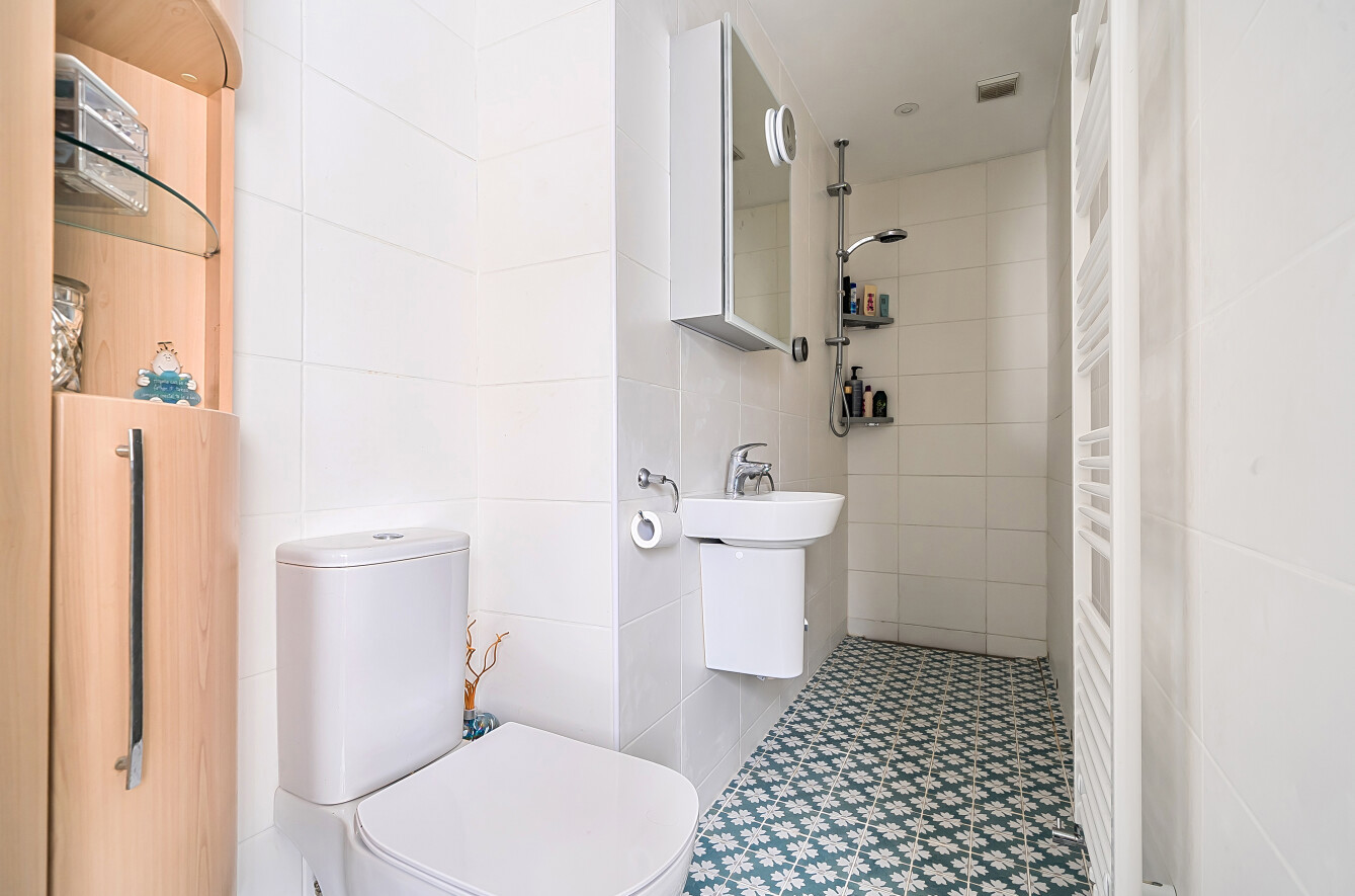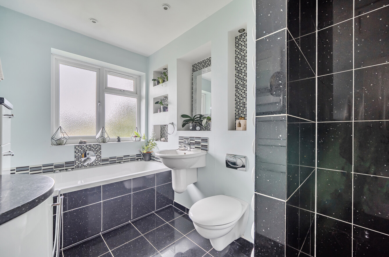 The family bathroom benefits from underfloor heating with both bath and separate shower.