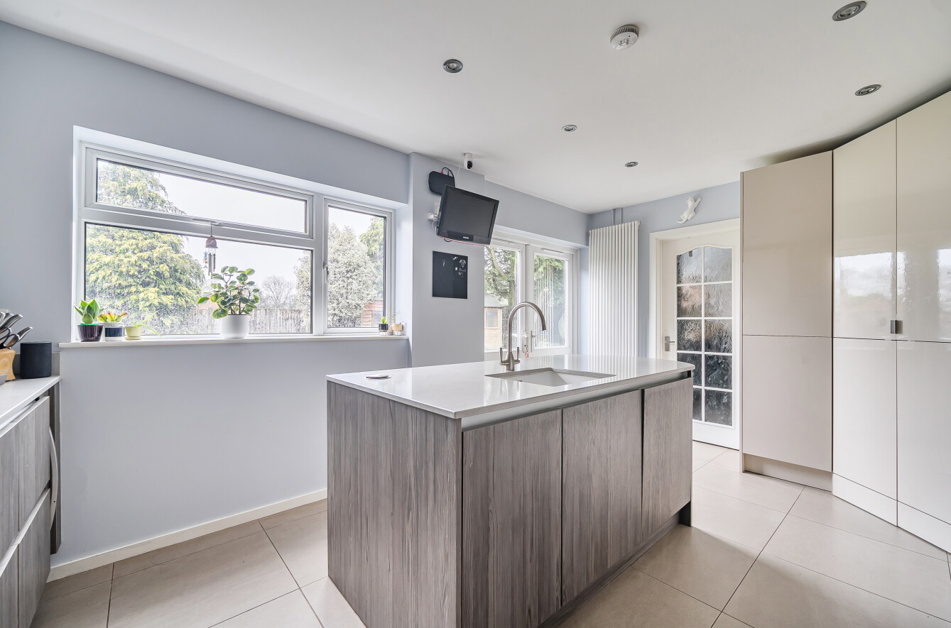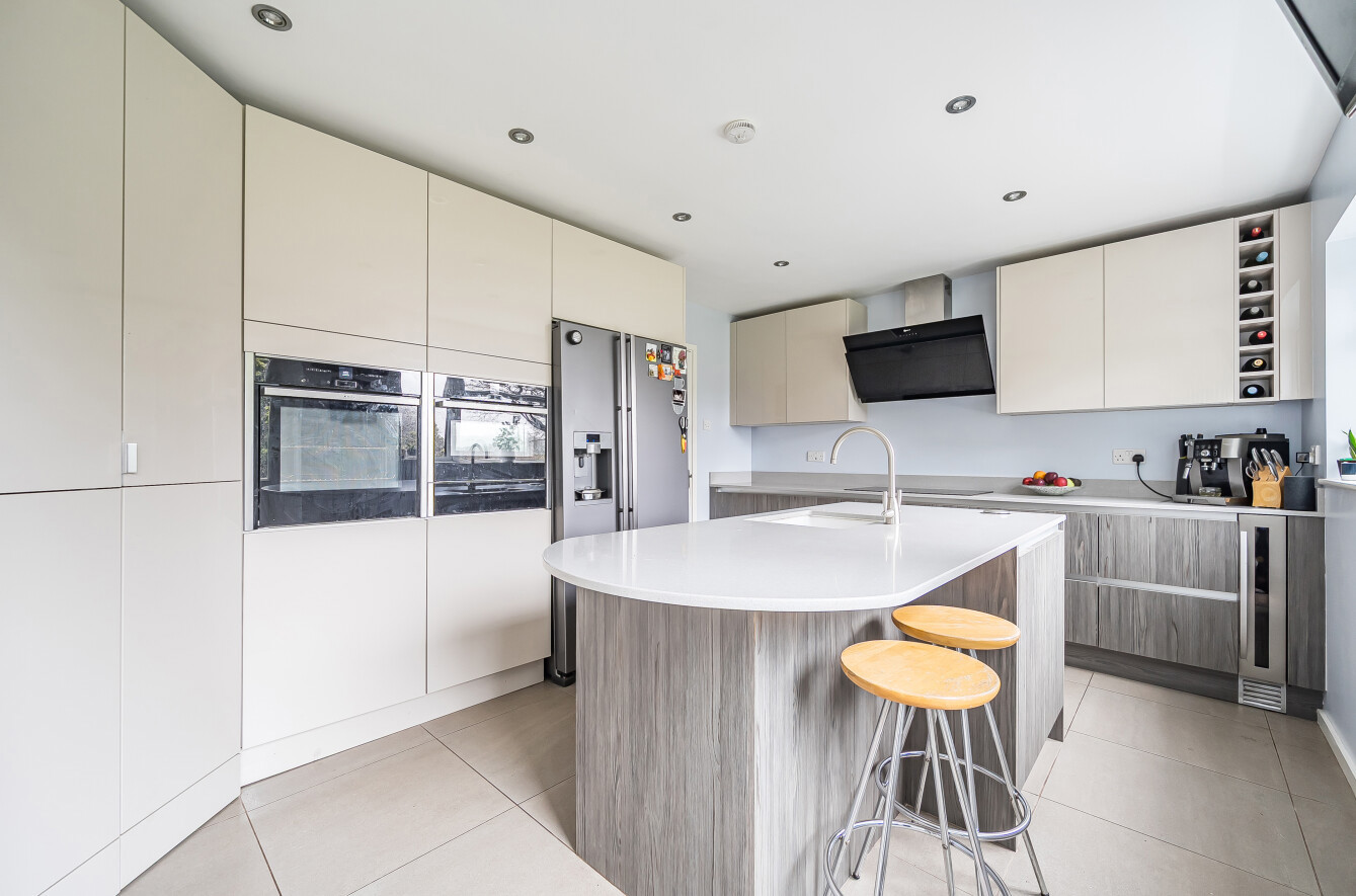 Also overlooking the garden is the kitchen. This is fitted with a modern range of drawer and cupboard storage including a central island which extends into a breakfast bar. There are a range of integrated appliances; dishwasher, double oven/microwave, plate warming drawer and induction hob with space for an American fridge freezer. There is a door directly out onto the garden, plus another leading to a utility room, cloakroom and the garage.