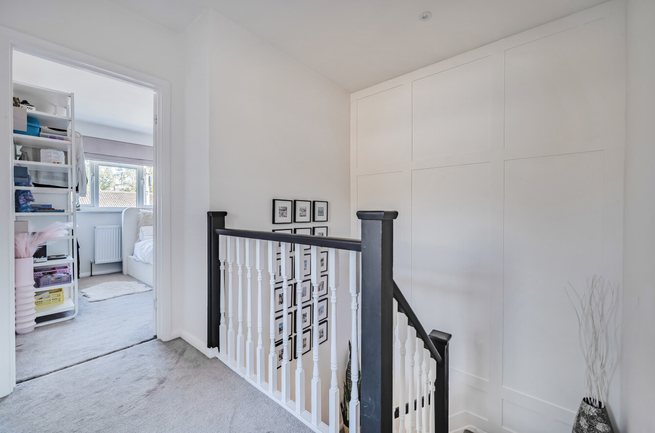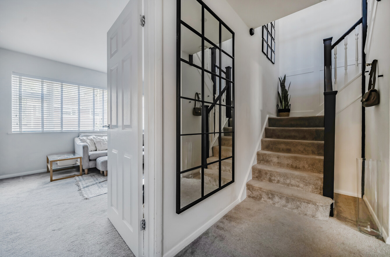 The new UPVc front door opens into a welcoming hallway with deep understairs storage cupboard, and stairs to a spacious 1st floor landing with feature panelled wall.