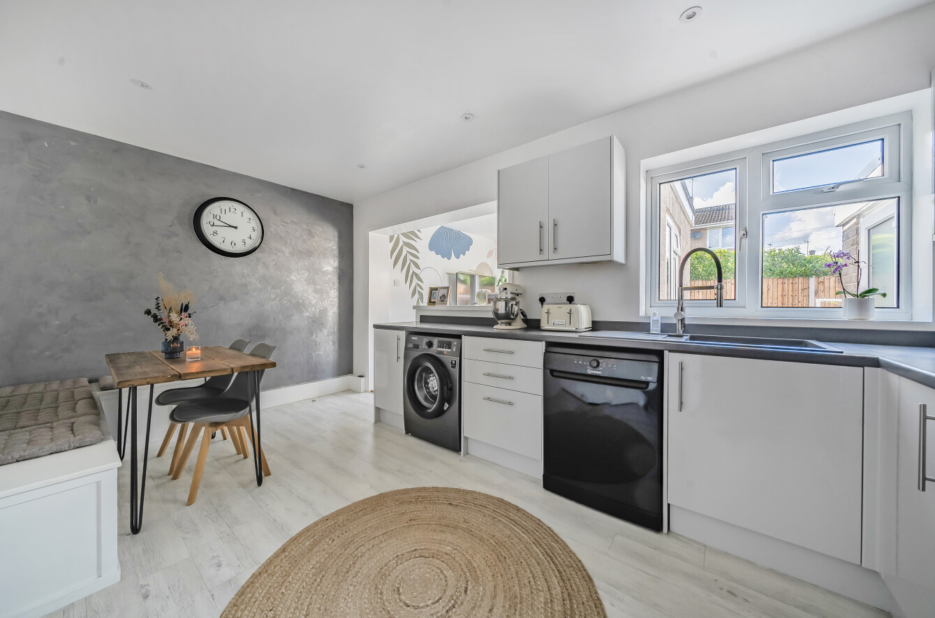 To the rear is a contemporary kitchen with a range of drawer and cupboard storage plus integrated oven and hob with space for further white goods. Amtico flooring has recently been laid in addition to built in bench seating around a breakfast table with useful storage beneath. This room is open plan to a family room with patio doors opening onto the garden, a great space for day to day family life and entertaining