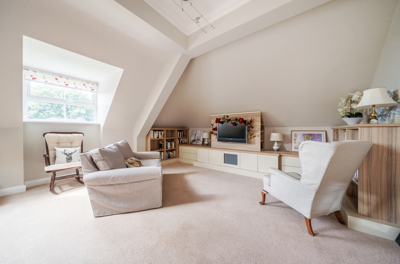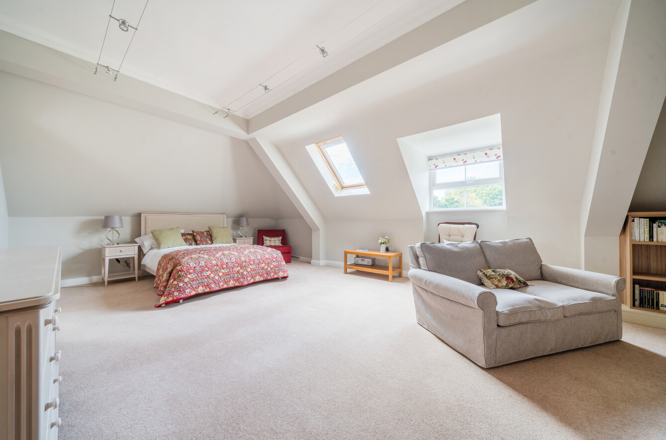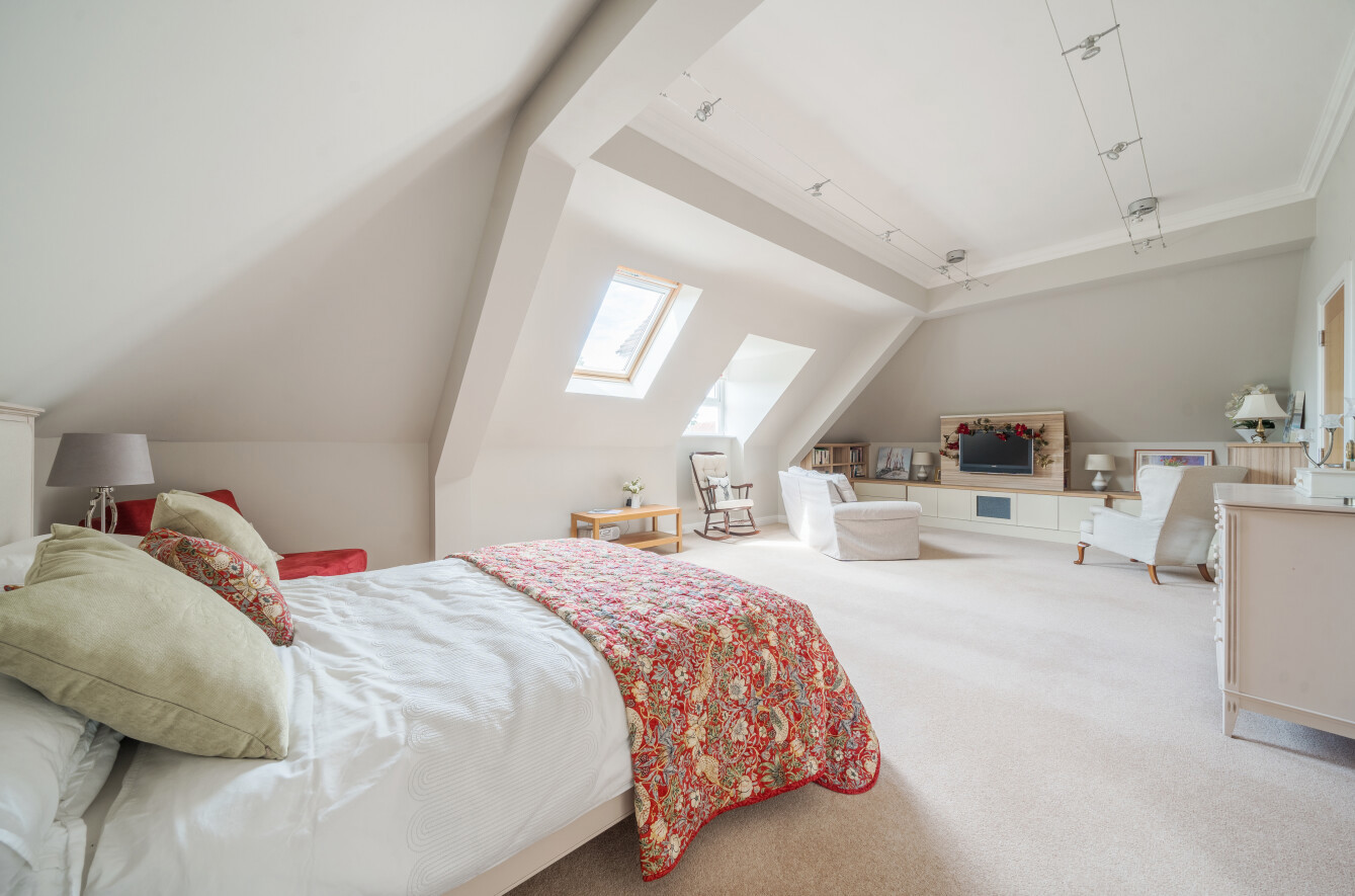 Stairs from the landing take you up to an incredible master suite, a large vaulted double bedroom with space for a lounge area with bespoke fitted tv unit and shelving, a walk in wardrobe and luxury en suite bathroom.