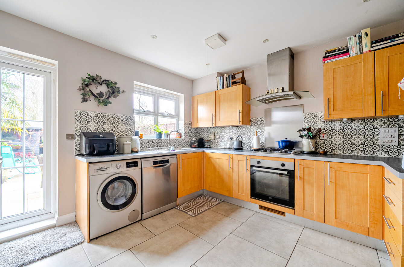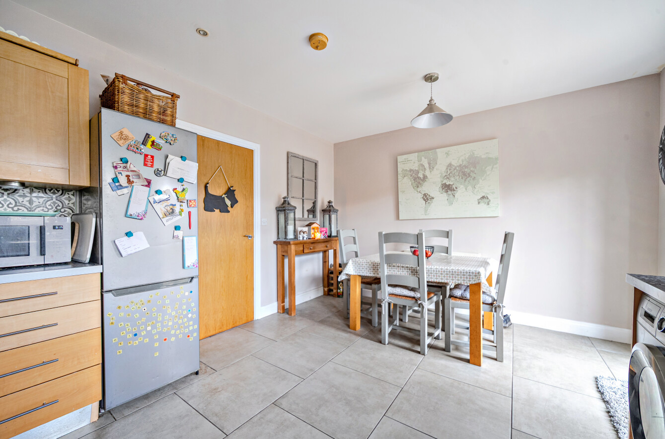 To the rear of the house, with patio doors opening straight onto the garden is a family friendly kitchen/dining room with plenty of space for a dining table to one side. There is a range of drawer and cupboard storage complemented by an integrated oven and gas hob with space for further white goods