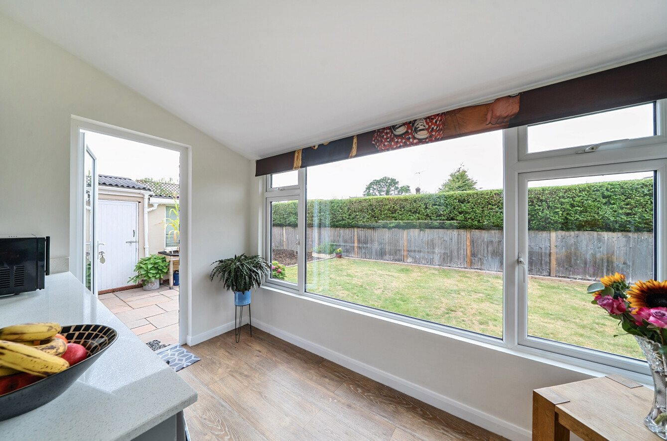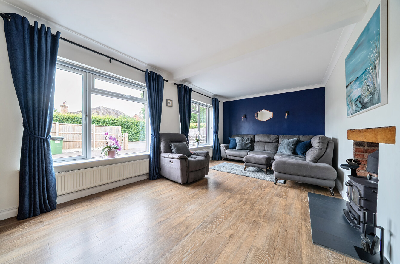 There are two generous reception rooms, both with large windows allowing natural light to flood in. The sitting room being 20'2 wide with an attractive central fireplace housing a log burning stove, whilst the family room enjoys a triple aspect with patio doors onto a south facing patio area.