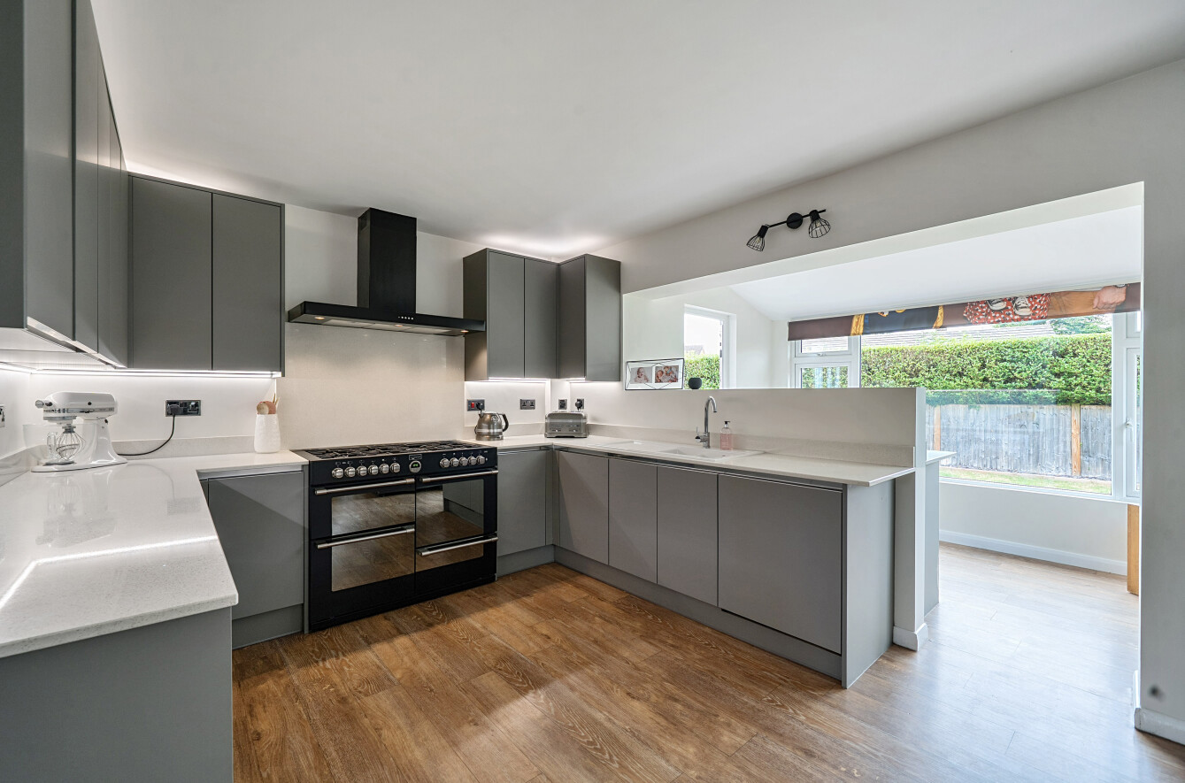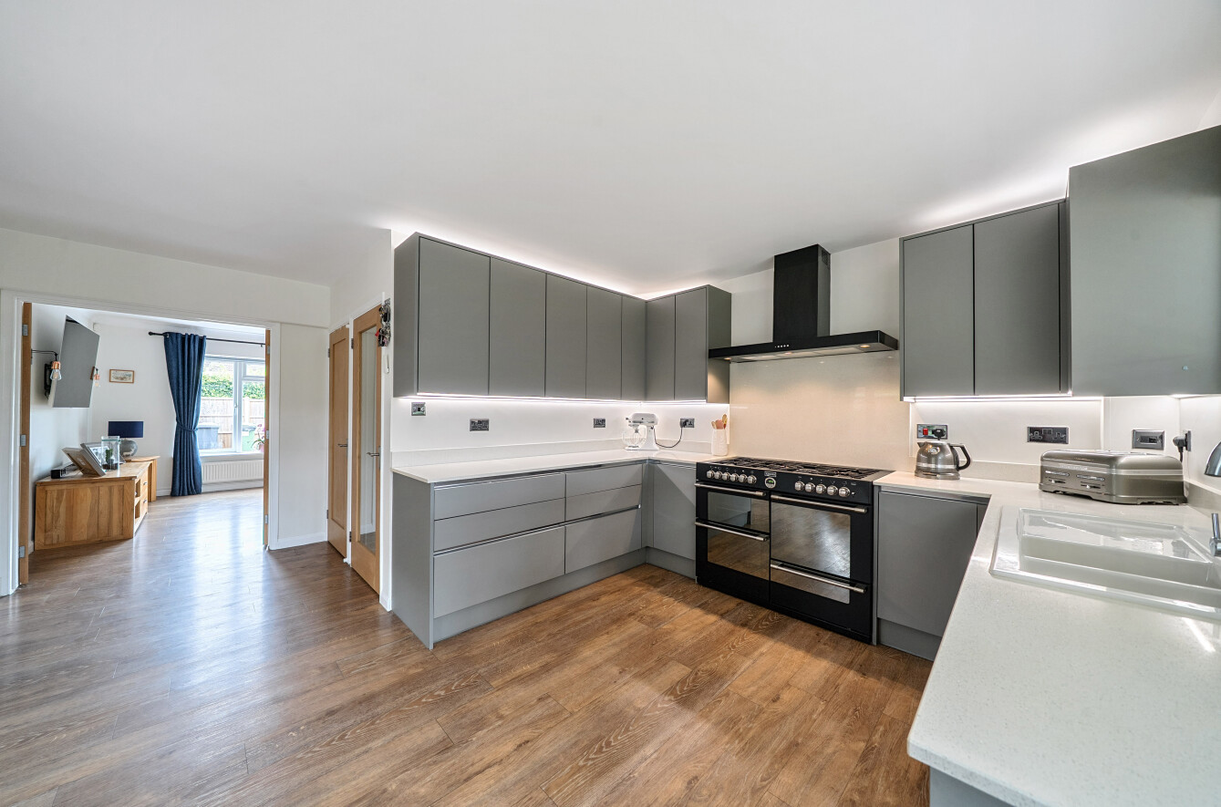 Also enjoying double doors onto a south facing patio is the dining room; enabling easy al fresco dining within the summer months. A wide opening links though to a modern well equipped kitchen. This offers a spacious area in which to bake and create family dinners with generous worktops, plus a range of drawer and cupboard storage with integrated dishwasher and discreet built in bin store.