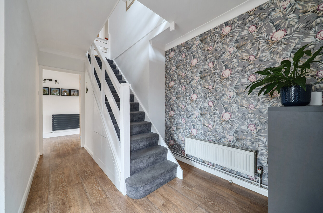 Spacious and welcoming hall with stairs to the 1st floor and large cloakroom.