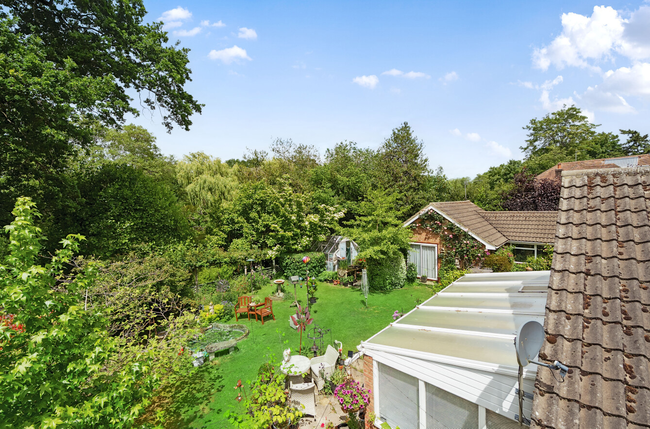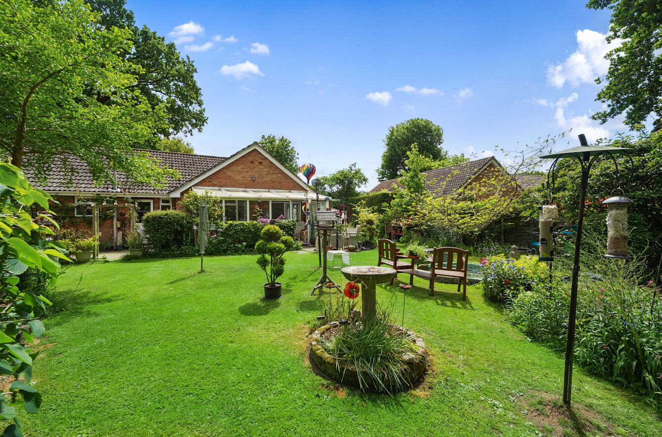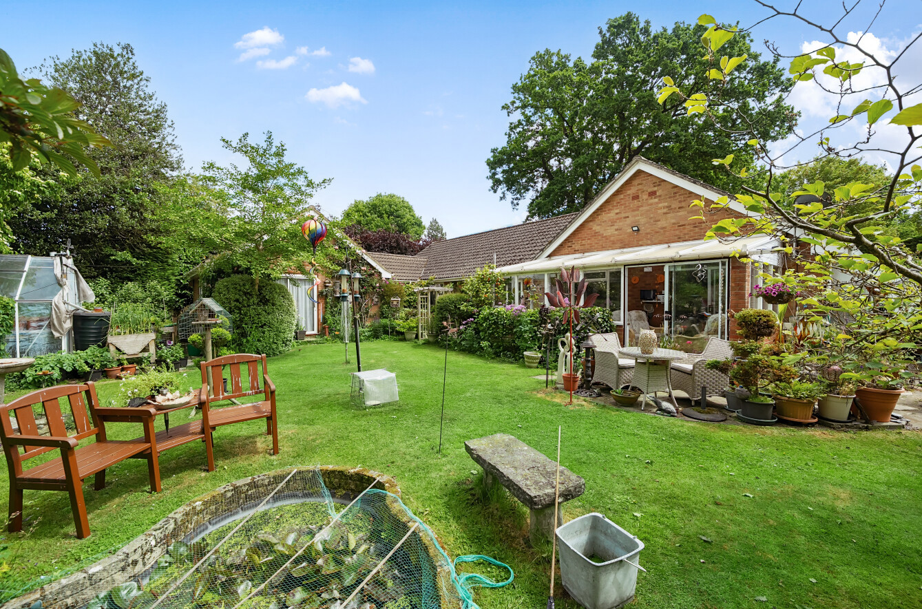 To the back of the bungalow are simply beautiful gardens, which have been lovingly curated and landscaped over the last 30 years. Adjacent to the conservatory is a paved patio area which is ideal for dining and entertaining, with lawns extending away edged by mature borders and feature shrubs offering colour and interest throughout the year. There is an ornamental pond, with two greenhouses and a tucked away spot with raised beds for fruit and vegetable growing. At the end of the formal garden is a Wisteria clad wooden divide with a gate through to a hidden garden. Steps take you to a second lawn which has pathways mown through it (so it can remain a wildlife haven) down to the River Wey, an idyllic spot to watch wildlife or simply enjoy the peace and quiet. There is a shed down here for the essentials. A very special spot to call your own.