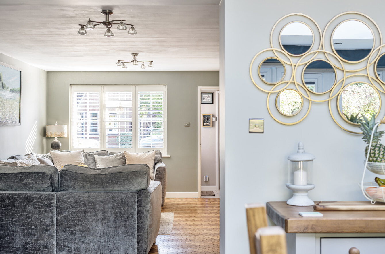 Upon approach to this carefully modified home with pretty wooden shutters fitted to the front windows, is a block paved driveway for three cars. Beyond the modern door is a hallway with sliding door to the cloakroom, stairs to the first floor and an oak door into the very spacious living room with original wooden floor.