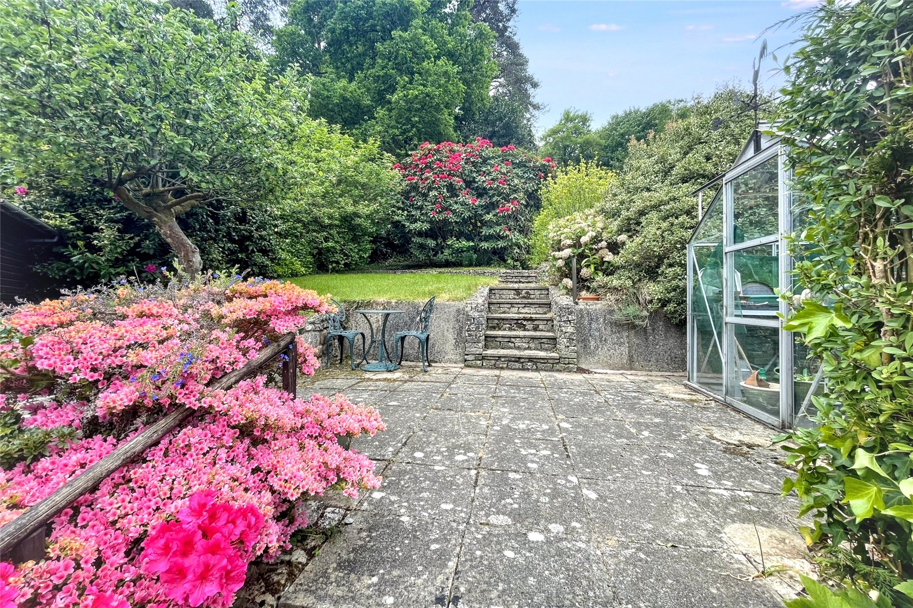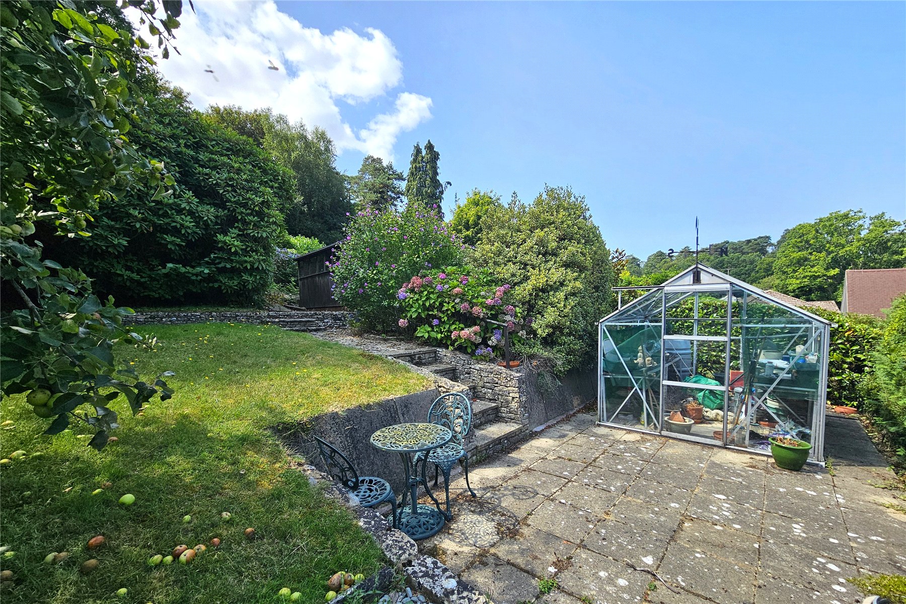 Patio area adjacent to the bungalow with formal raised beds and steps extending up to upper lawned terraces with a children's play house, shed and greenhouse interspersed.
