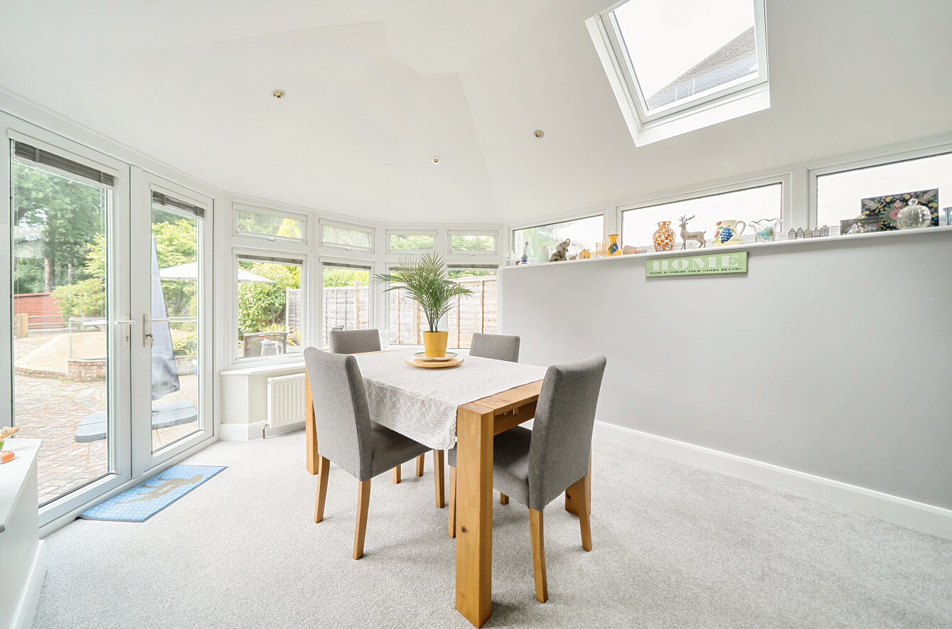 The dining room over looks the garden and benefits from patio doors out onto the garden as well as internal double doors into a conservatory extension.