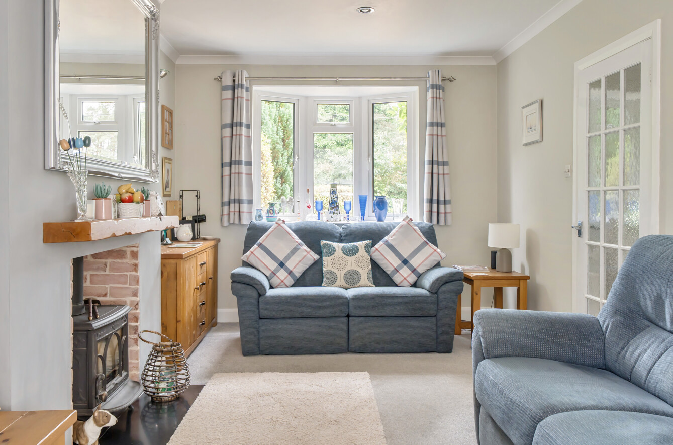 Immediately to the right is a lovely sitting room with south facing bay window and central fireplace housing a wood burning stove, this is open plan to the dining room, creating a large and spacious entertaining area whilst still providing clearly defined room usage.