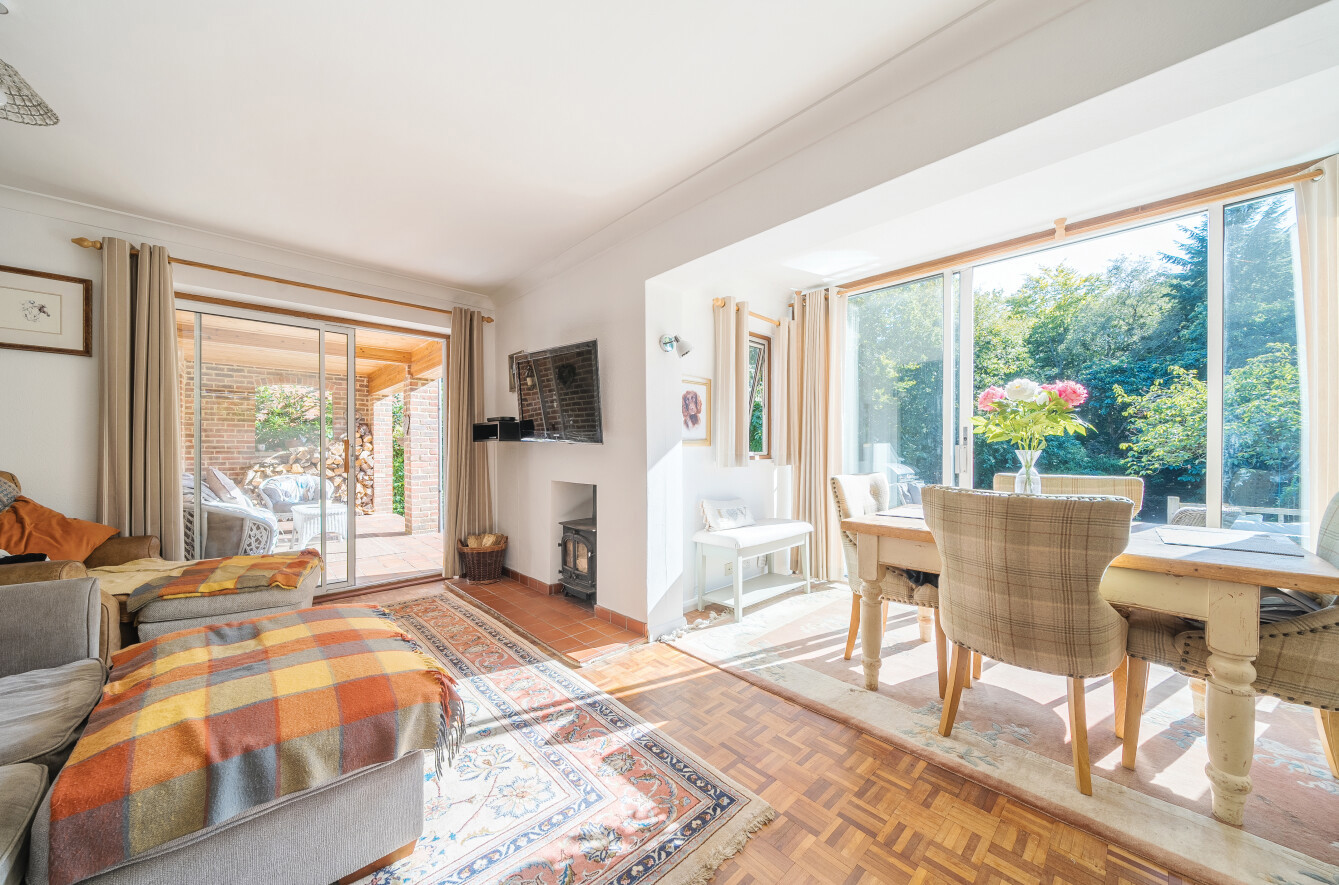 Large sitting room with a feature wood burner, enjoying a double aspect with patio doors opening onto both the garden and separately to a covered loggia area