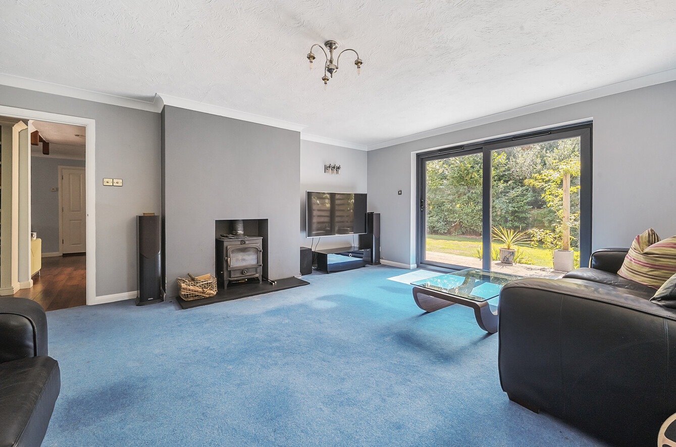 The very spacious double aspect living room is a wonderful place to relax with Clearview log burner and sliding patio doors.