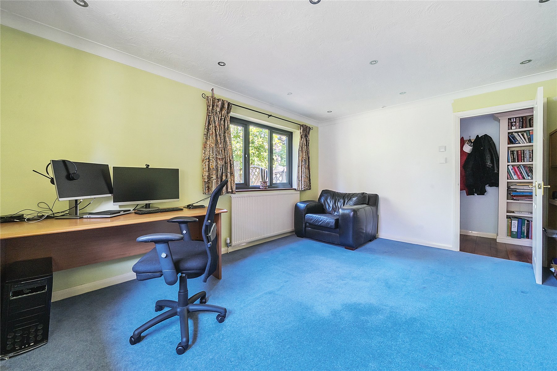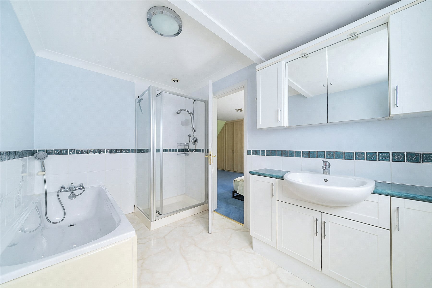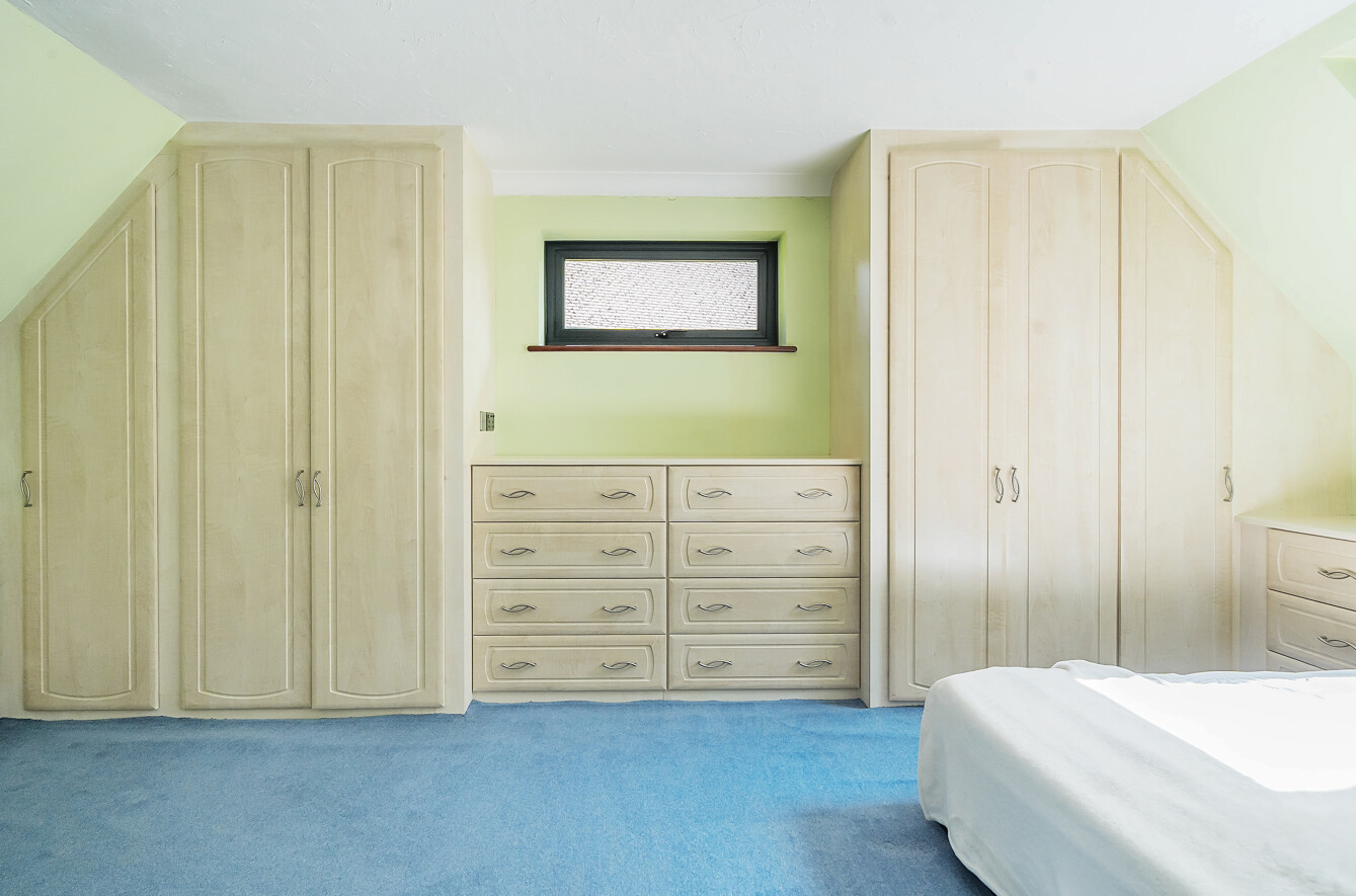 Upstairs, off the bright landing with large airing cupboard, are four generous double bedrooms; all with fitted storage. The large primary bedroom benefits from an en suite bathroom with bath with handheld shower, towel rail, a separate shower cubicle, WC, and sink with fitted storage surround.