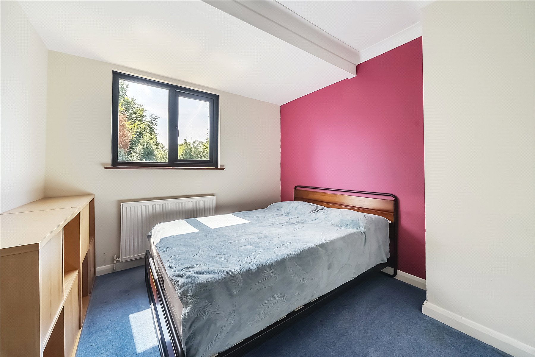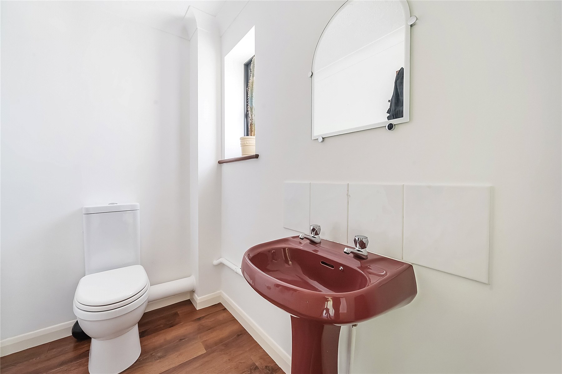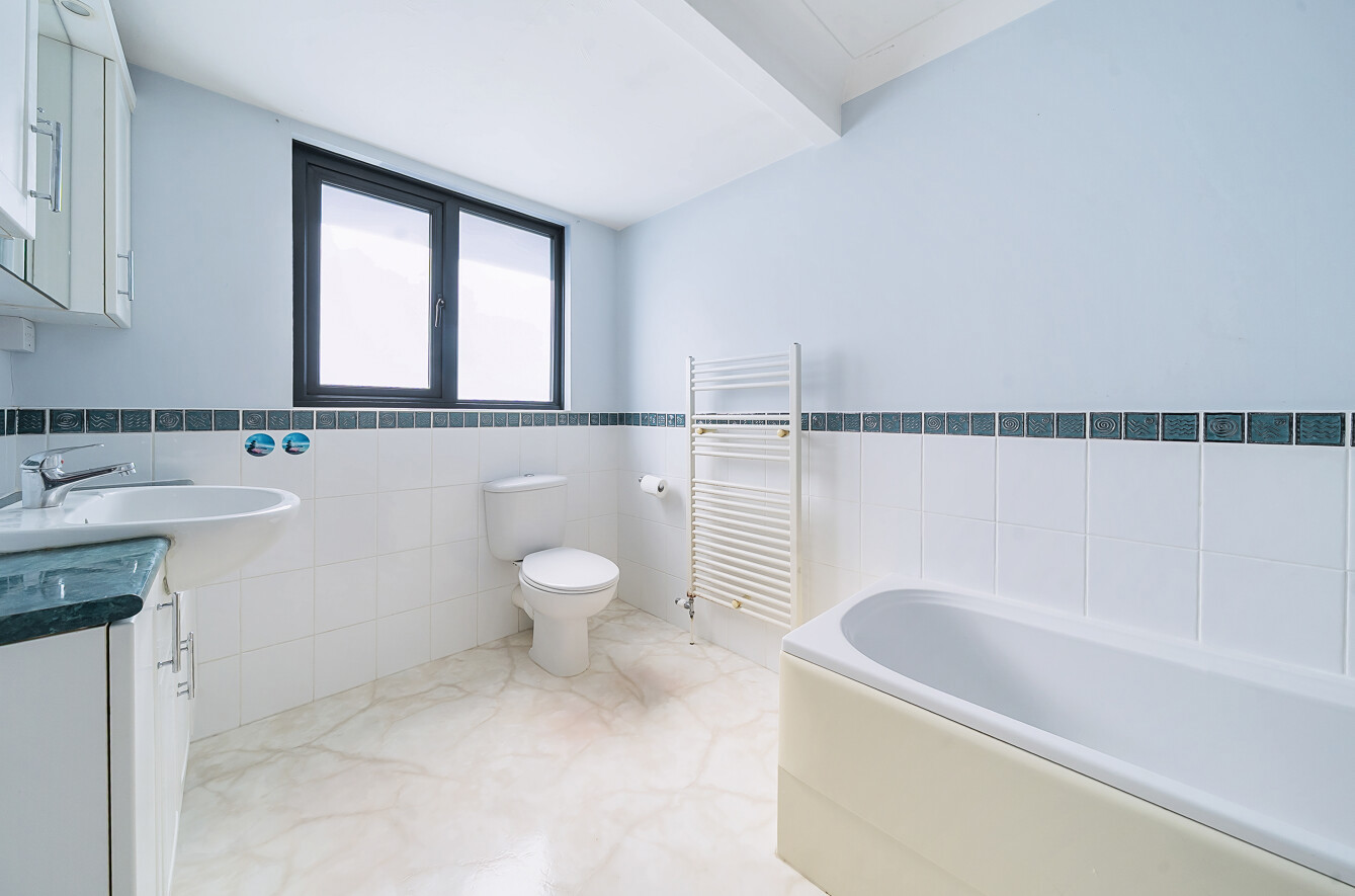 The main family bathroom encompasses a bath with handheld shower, radiator with towel rail, WC and sink with storage below.