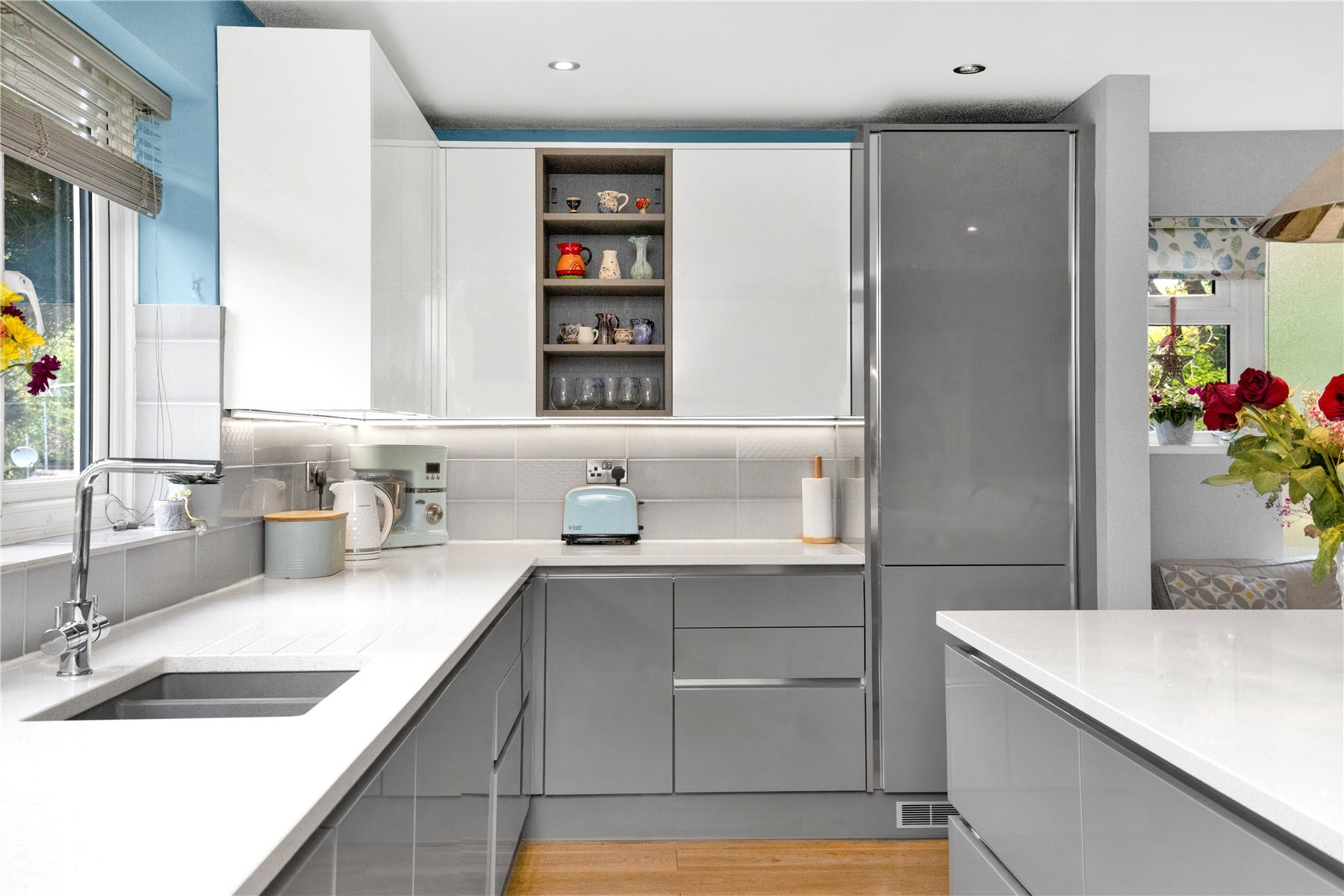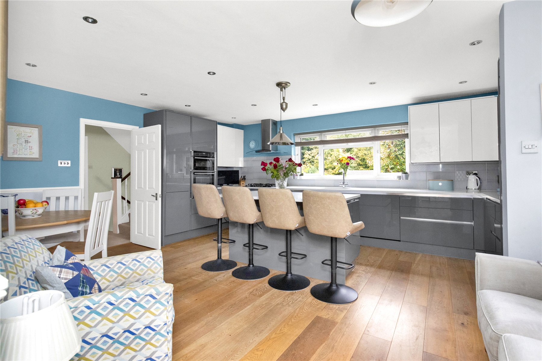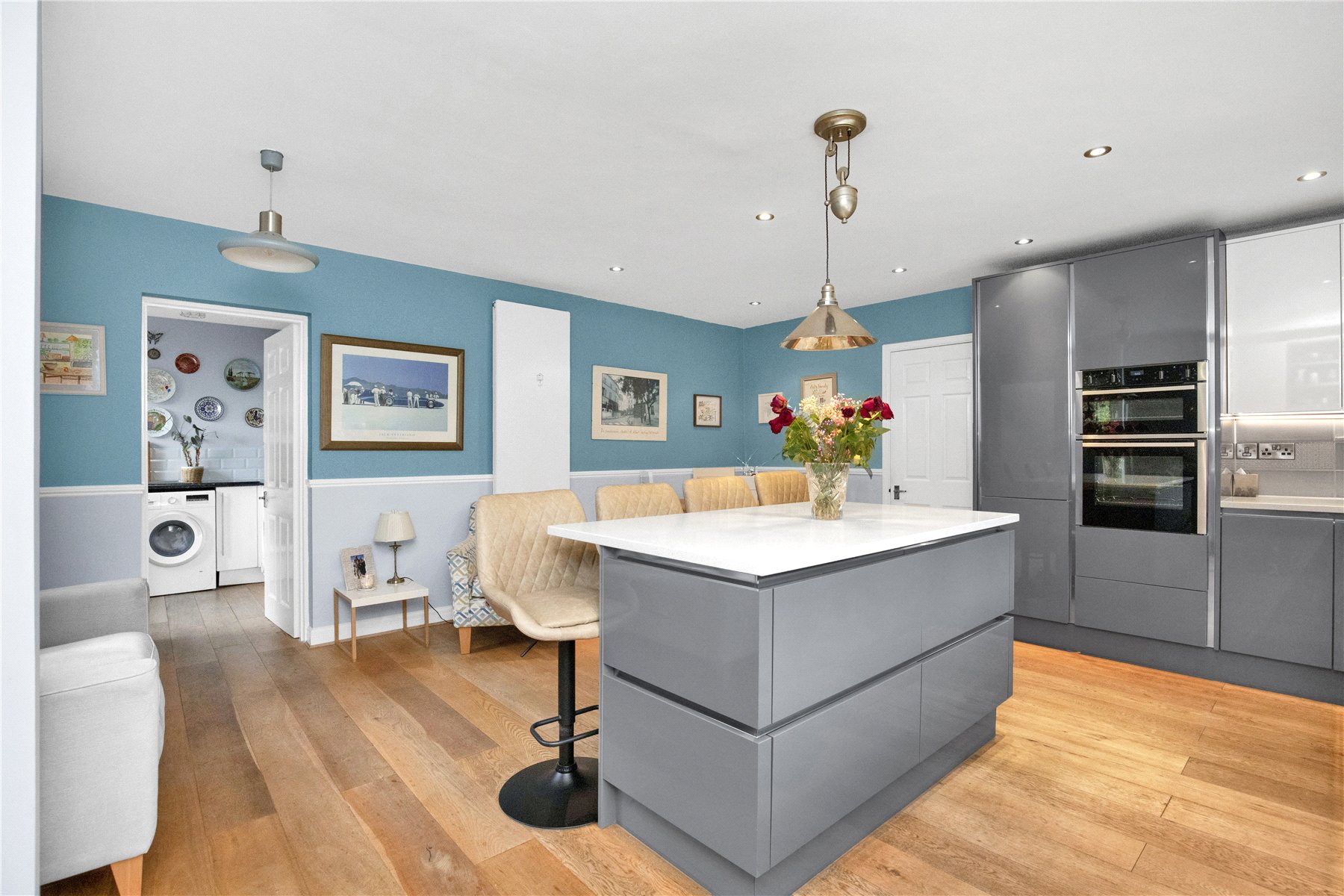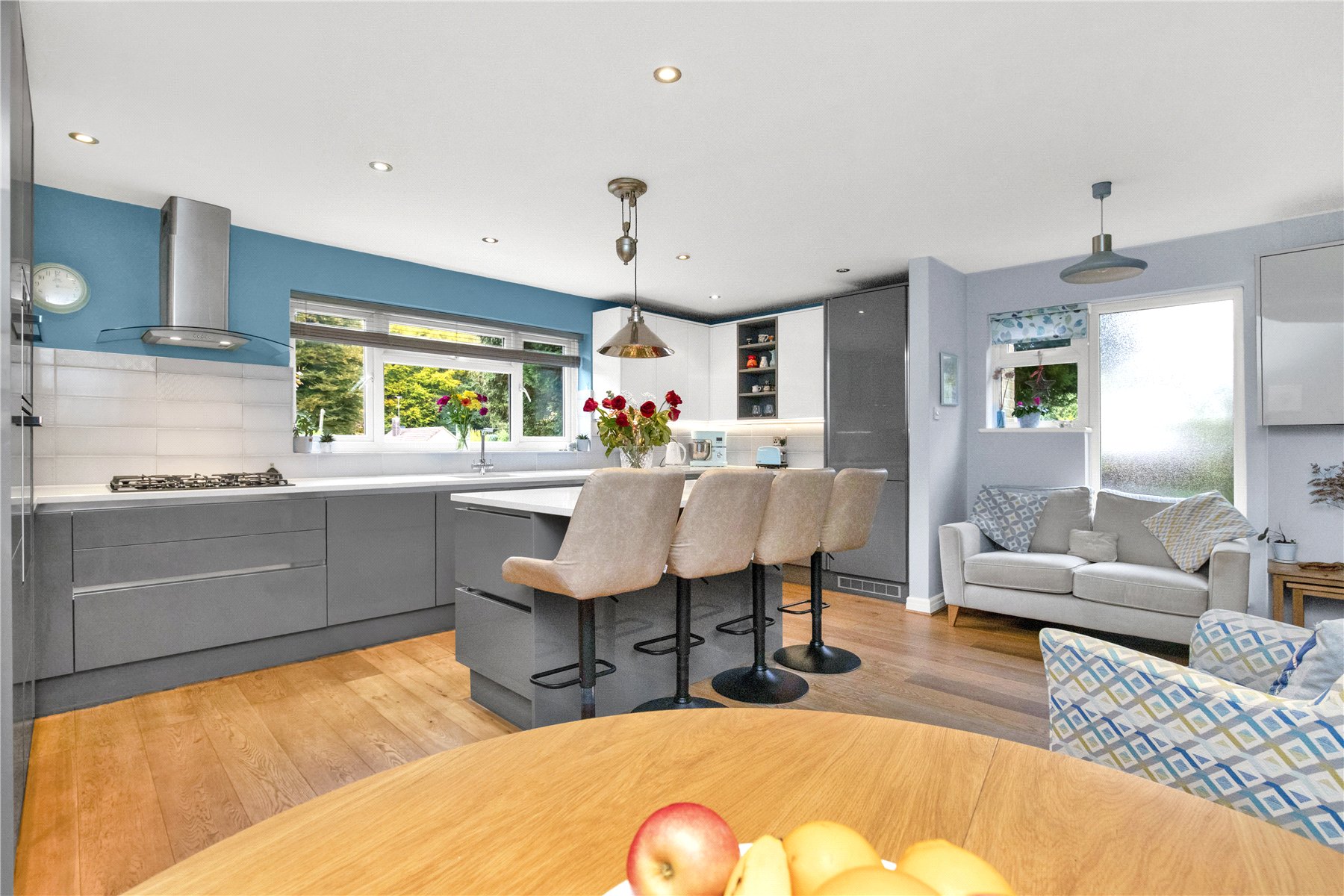 To the right hand side is a superb dual aspect kitchen/family area, with space for a breakfast table in addition to the breakfast bar adjoining a large central island, which also has several deep storage drawers, complimenting the range of fitted drawers and cupboards within the kitchen. Seamlessly complimenting this are a range of integrated appliances.