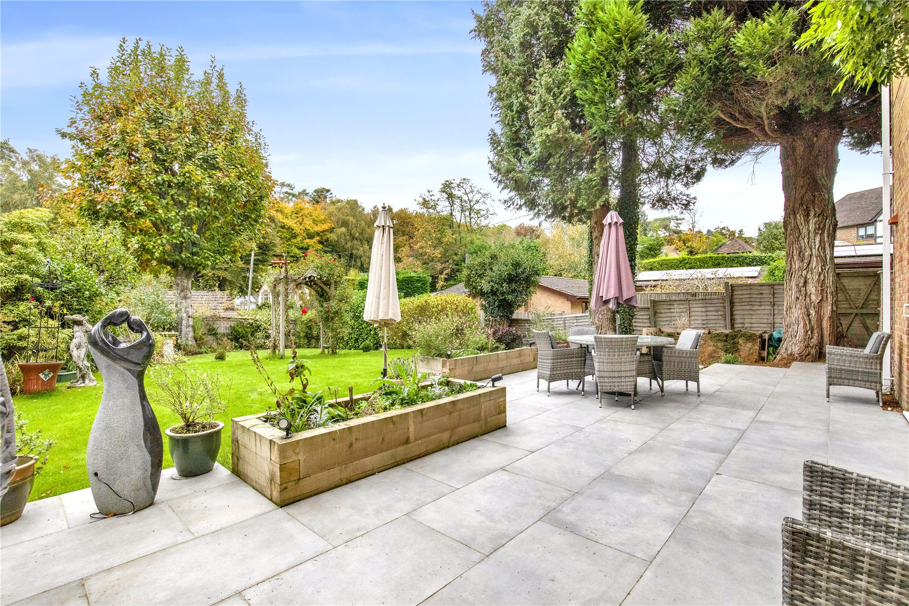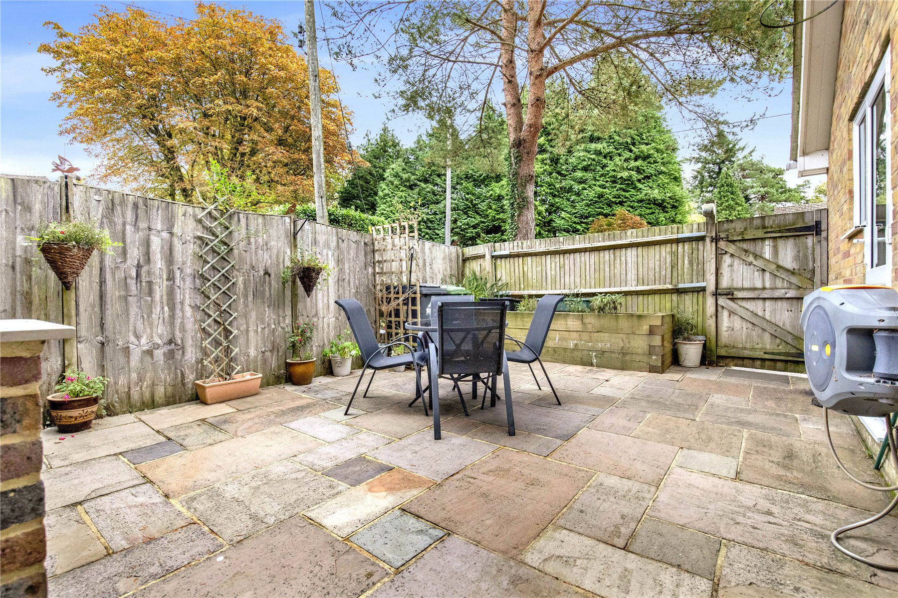 A door from the kitchen leads into a good sized utility room with a side door onto a tucked away and private paved patio with raised sleeper beds; great for grabbing a moments tranquillity with a morning coffee, or a quiet area to relax in if the children are enjoying the main garden!
