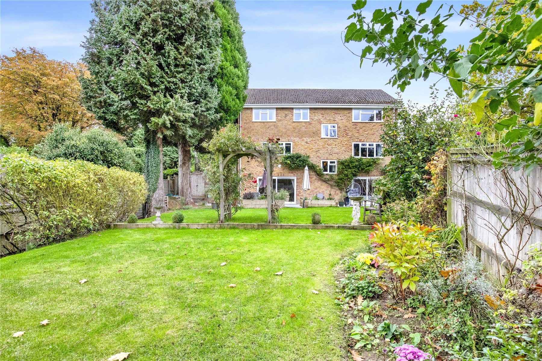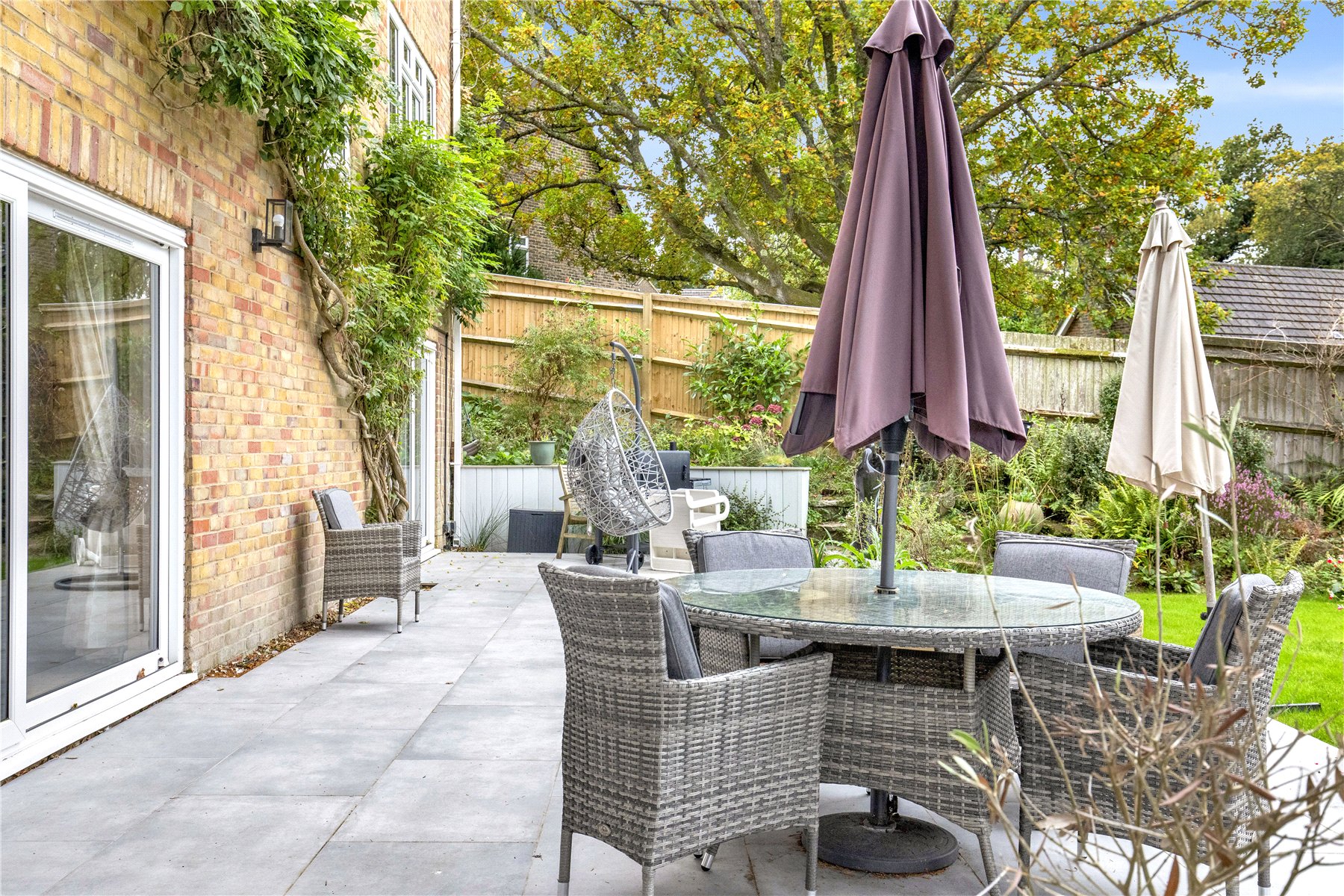 The gardens are a real delight, and predominantly fall to the rear of the property, enjoying the afternoon and evening sun. Climbing the rear elevation of the house is a mature Wisteria, with cascades of fragrant blooms emerging each Spring. The scent can be enjoyed from the recently paved patio below which stretches the full width of the house, with both light and power in situ flanked by formal raised sleeper beds; the perfect spot to host and entertain. The remainder of the garden extends away into a generous lawn interspersed with mature shrubs and trees, and mature flower beds to the boundaries.
