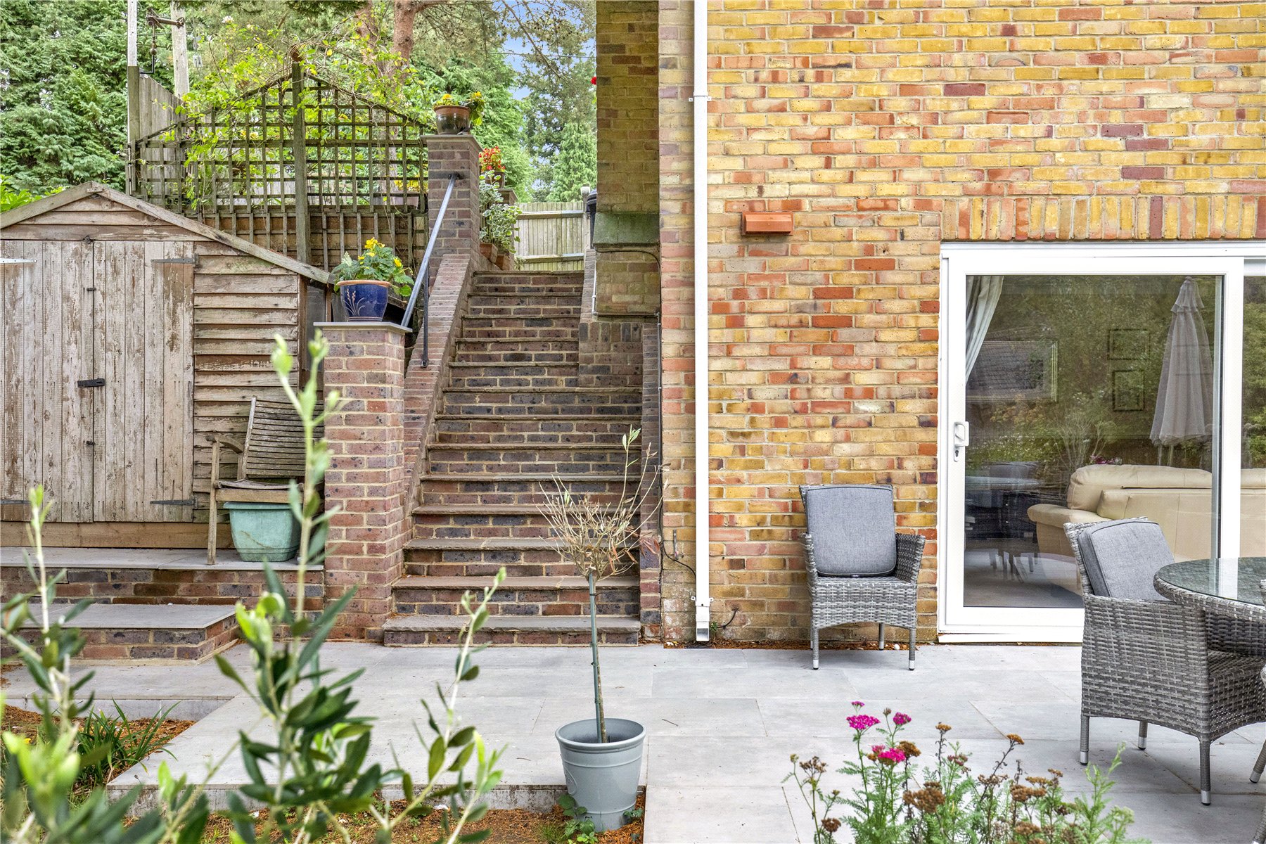 Tucked away to one side is a growers area, with the bed full of fruity delights including several fruit trees. A larger side garden exists to the opposite side, adjacent to the kitchen/utility. There are steps up to this beside a useful garden shed, emerging into a 2nd paved patio area with further raised sleeper flower beds.