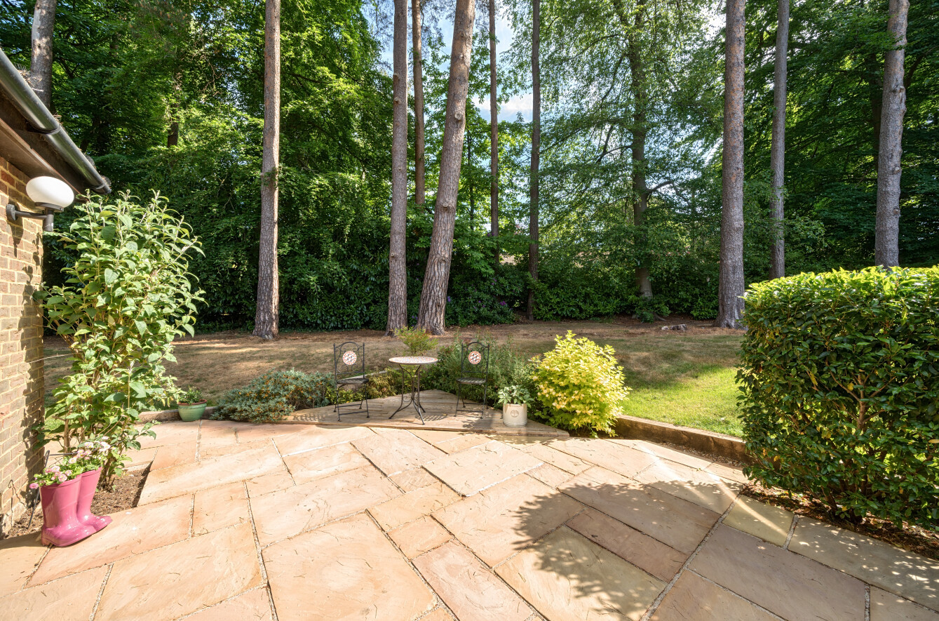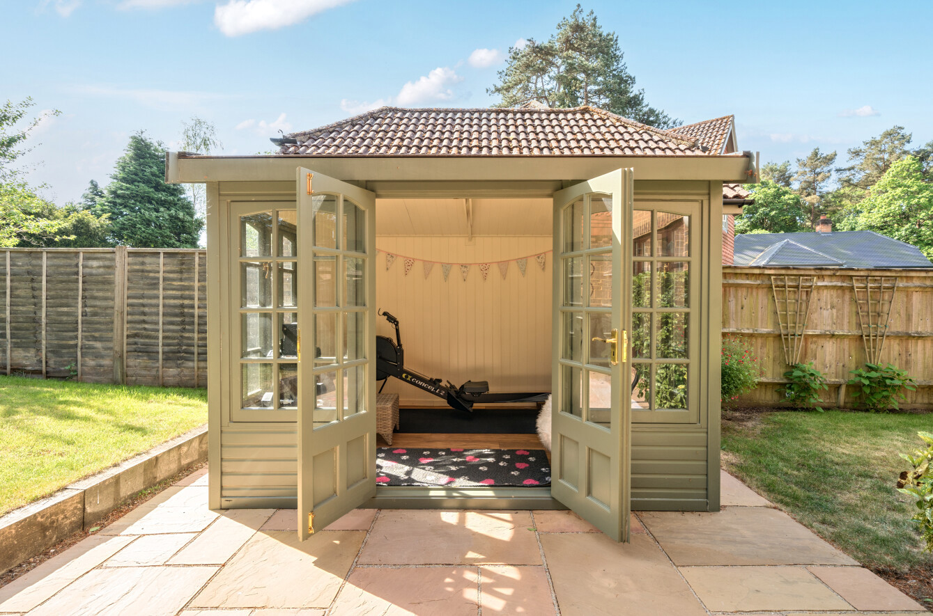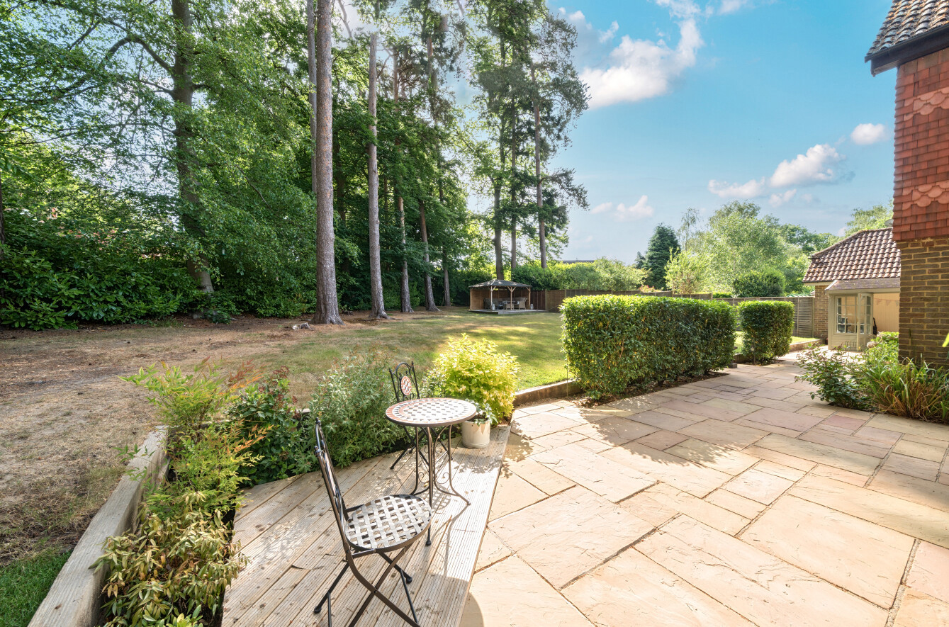 The house sits in a plot of 1/3rd of an acre with wrap around gardens, offering space for the whole family. A deep patio extending the full width of the property sits adjacent to the kitchen and sitting room with a detached garden cabin to one side offering an ideal gym/studio (there is power). The remainder of the garden is laid to lawn with mature tree's providing a lightly wooded outlook. To the rear of the garden is a stunning paved patio, covered with a substantial wooden gazebo offering protection from both the sun and the rain, described by the current owner as the "sundowner terrace", the perfect spot to relax and enjoy your evenings. Tucked away in the further opposite corner, behind the garage is a useful shed and woodstore.
