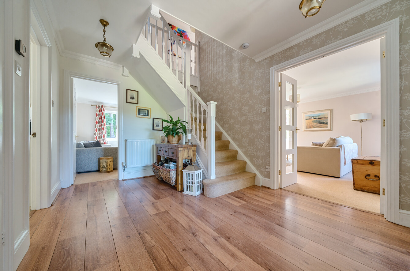 The front door opens into a spacious entrance hall with plenty of room to welcome guests and visitors, plus the all important cloakroom, a large coats cupboard and stairs to the 1st floor.