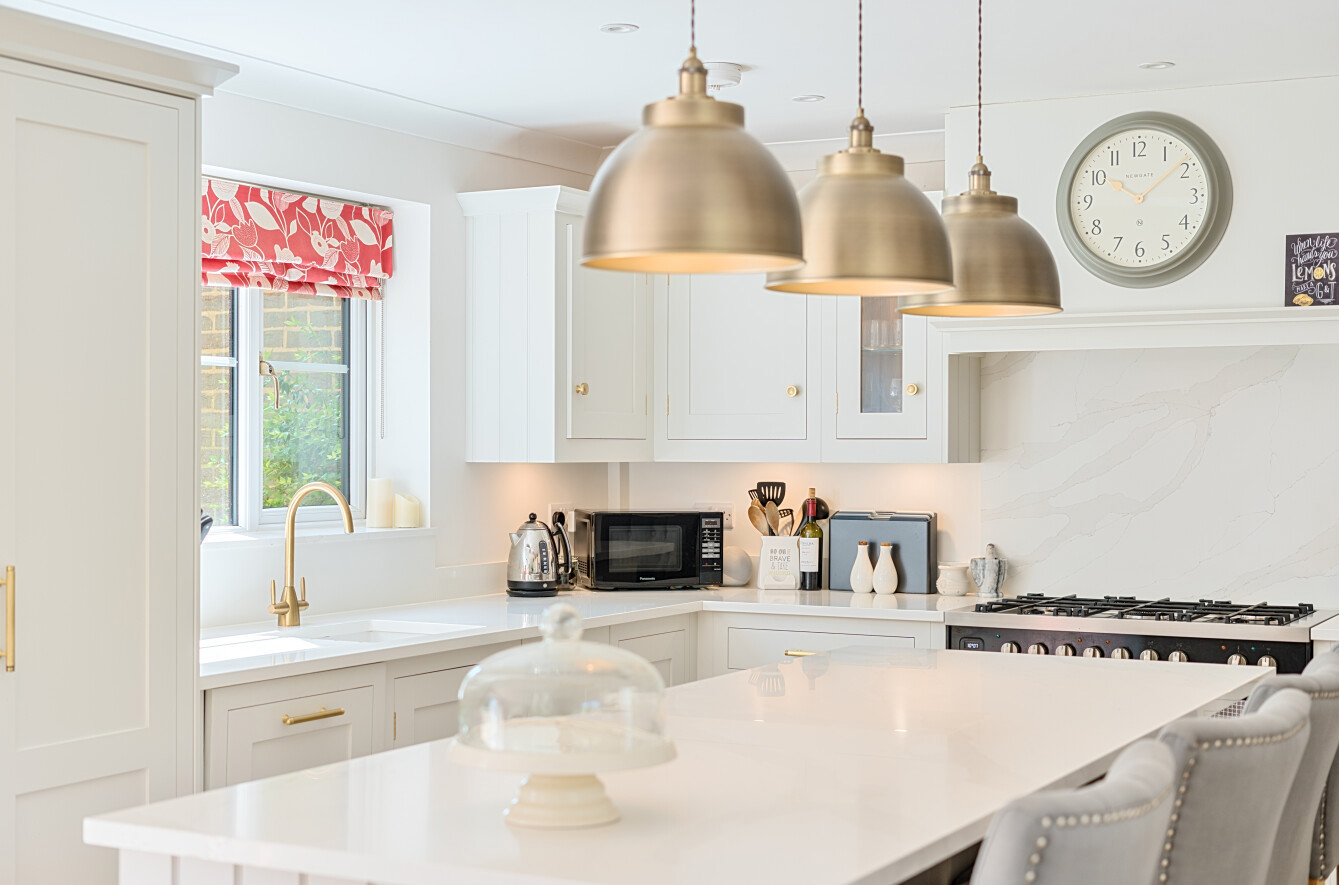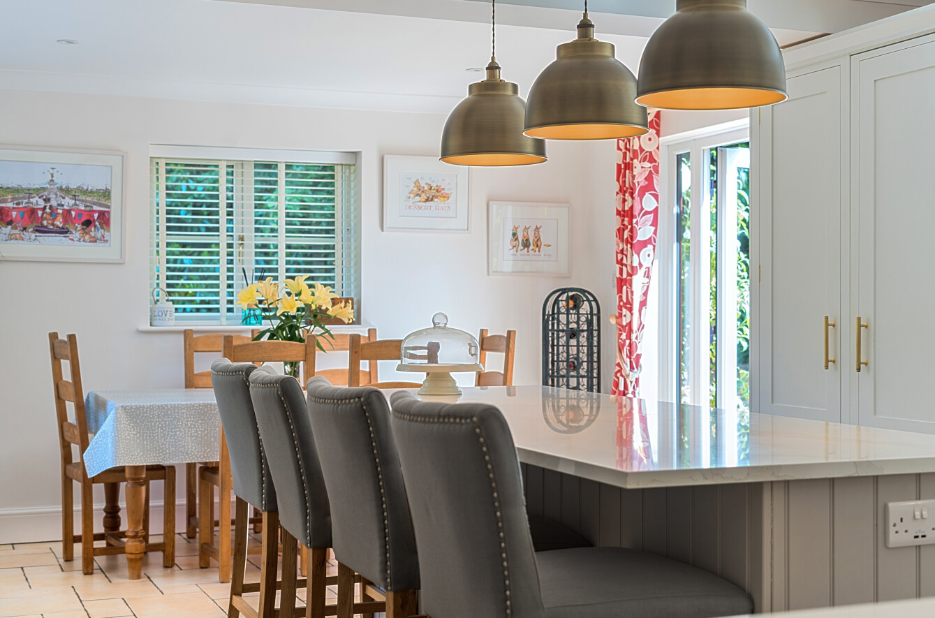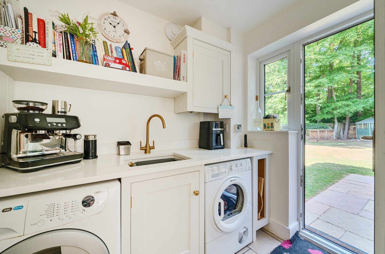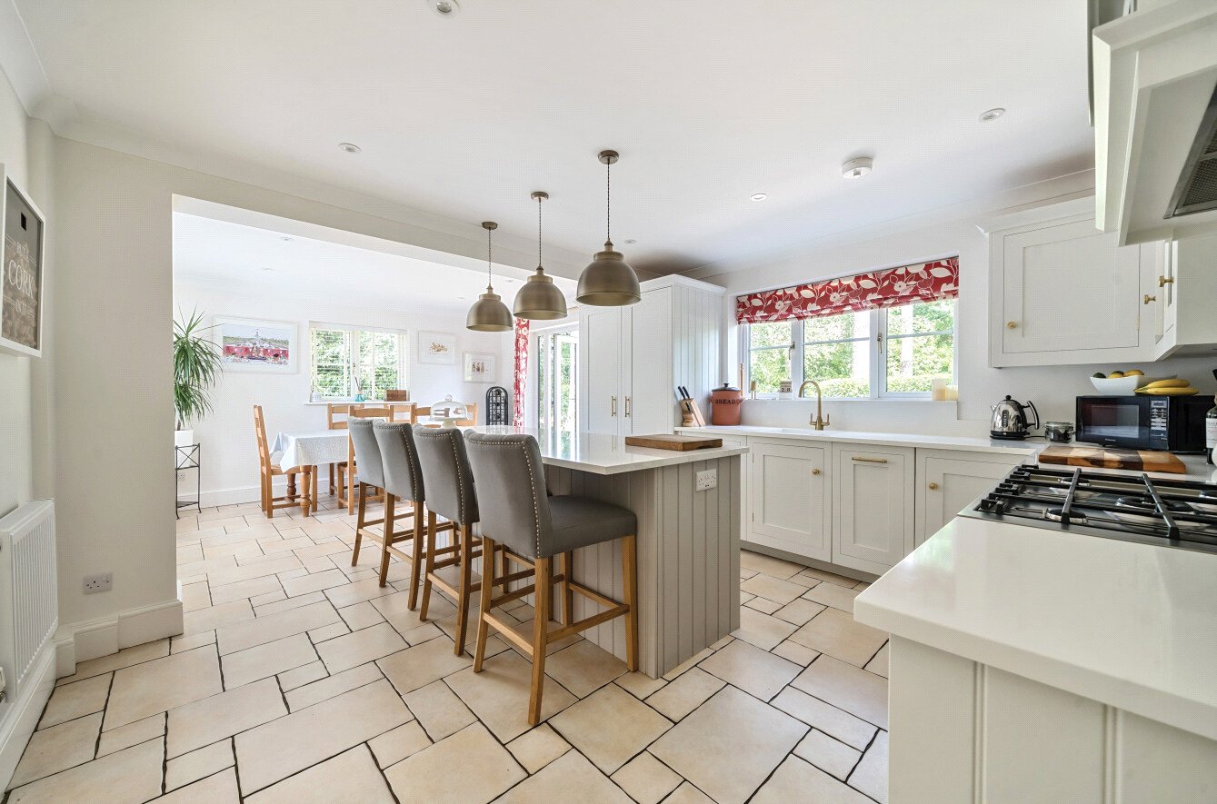 The bespoke kitchen was designed, hand made and fitted by Harvey Jones in 2021 and as well as plenty of drawer and cupboard storage there is a range cooker with 5 ring gas hob, plus integrated wine fridge, fridge freezer, dishwasher and bins store. Complementing this is a large central island/breakfast bar, whilst still leaving a large dining area for formal table and chairs and occasional furniture.