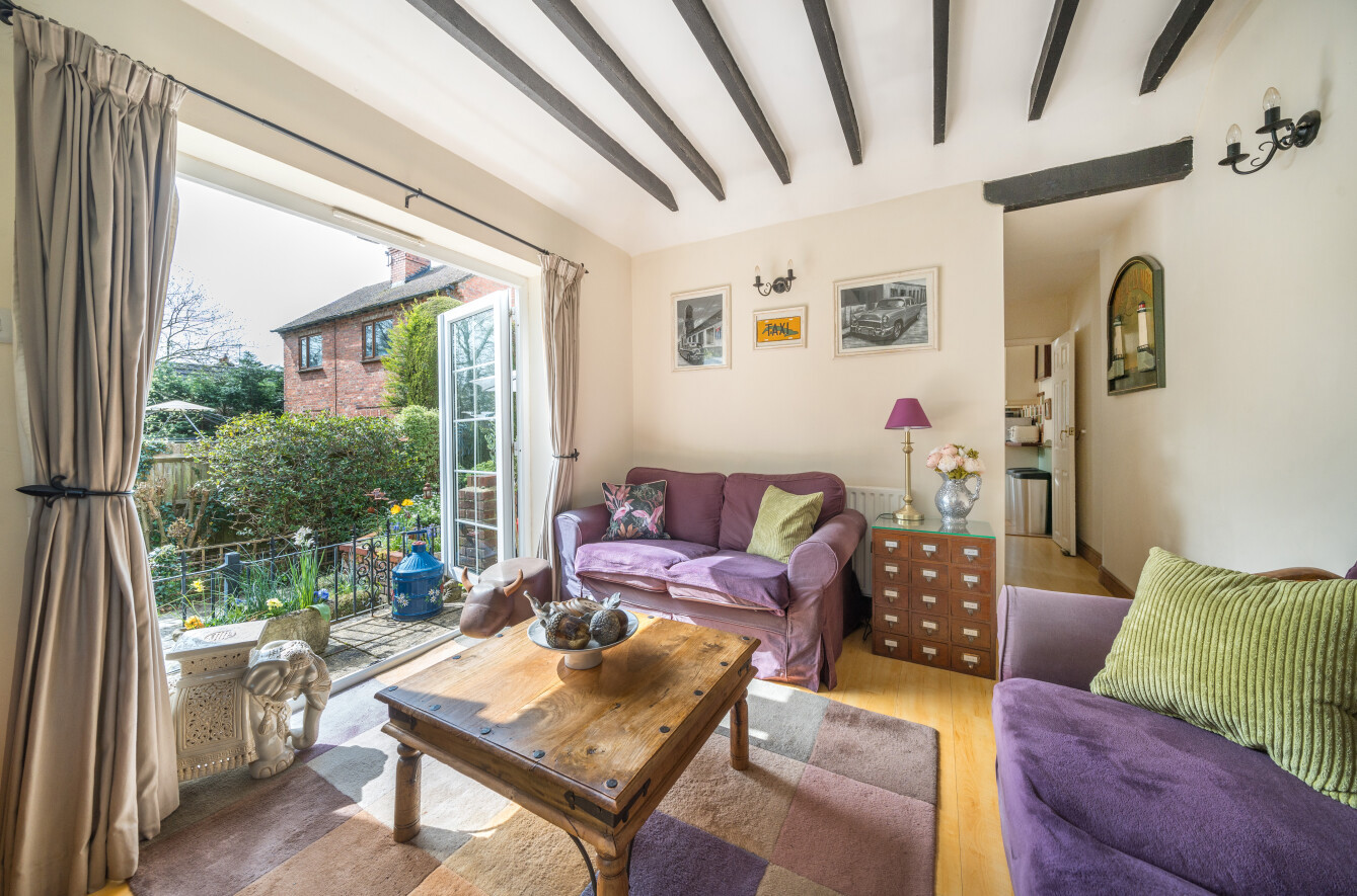 To the rear is a generous sitting room with central feature fireplace and patio doors opening onto a sunny courtyard patio area and the garden beyond.