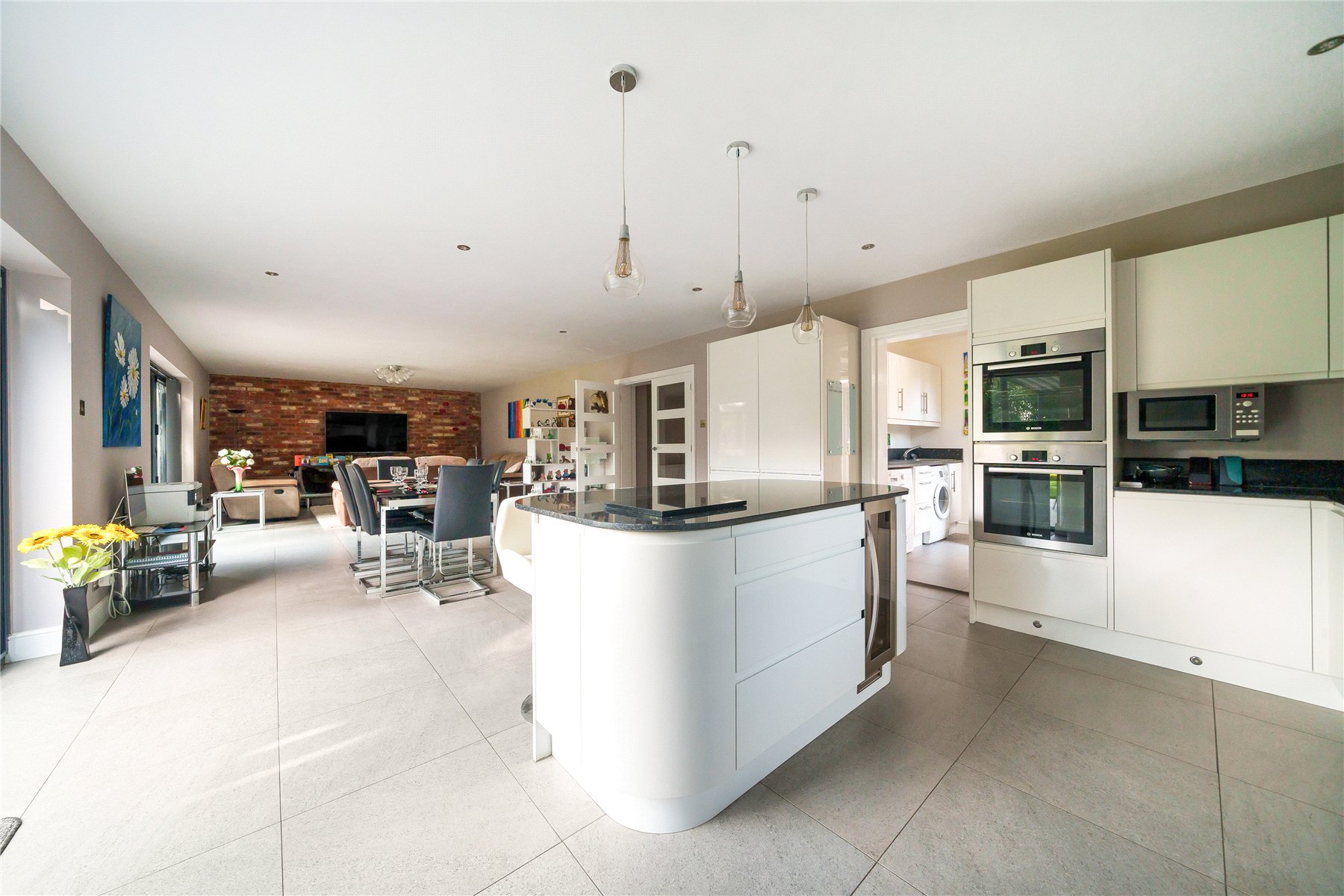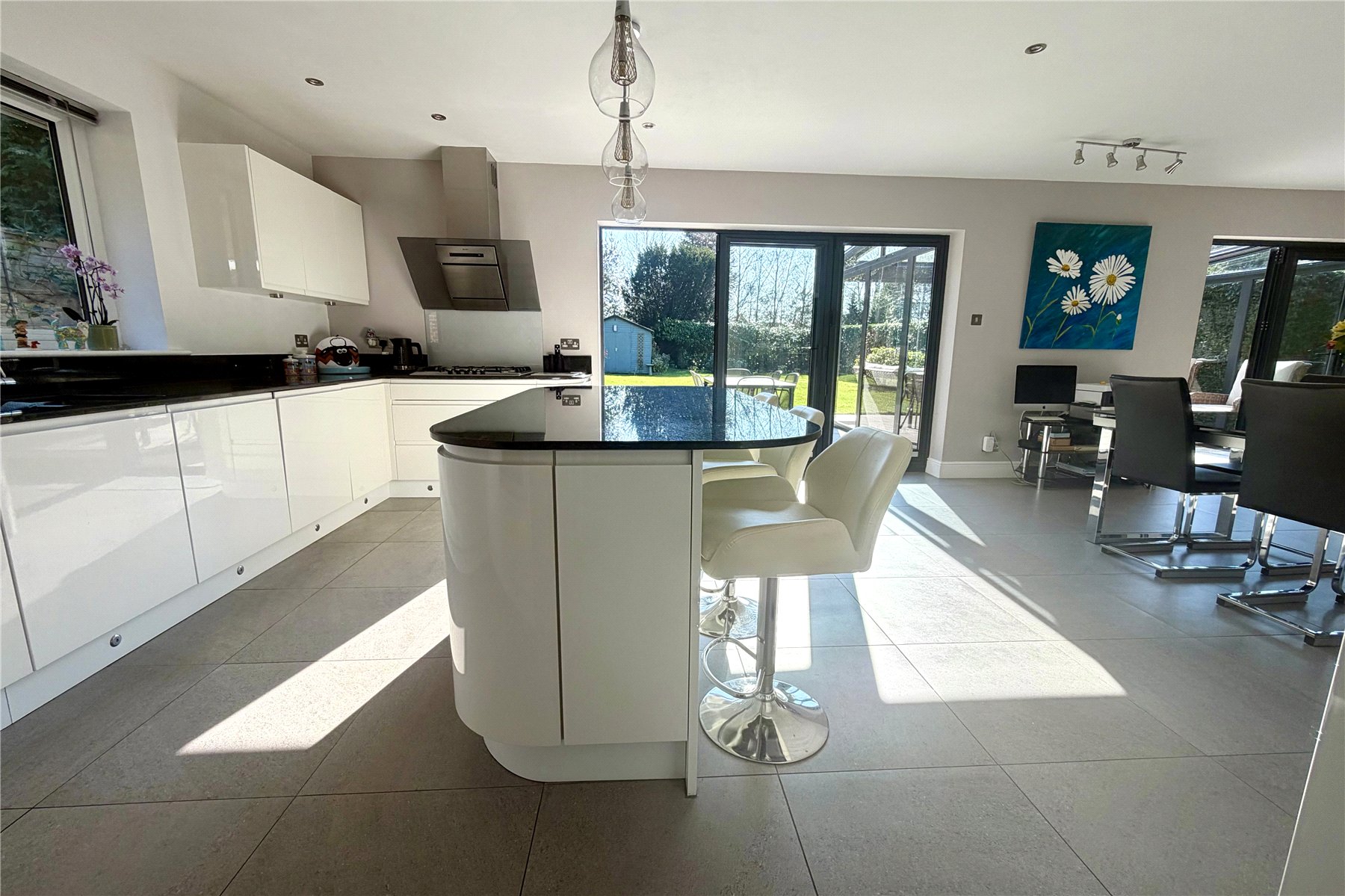 The front door opens into a large hallway with attractive oak and glass stairs/balustrade to the 1st floor. There is a games room/snug with central electric fire but the real heart of the home is a superb open plan kitchen/dining/family room, (which benefits from underfloor heating and thermal blinds) which extends across the whole of the rear of the property. Bi fold doors from the kitchen area open onto a large patio, whilst bi fold doors from the family area open onto a large garden room with glass ceiling and Ultra-slim sliding doors, creating an impressive aesthetic of a seamless "floor to ceiling" view onto the garden. The perfect space for entertaining or family life. The kitchen is well equipped with extensive drawer and cupboard storage, low level plinth lighting and a sizeable breakfast bar. Integrated appliances include a 5 ring gas hob, bin store, double oven, dishwasher, fridge, freezer and wine fridge. Off the kitchen is a separate utility room with door opening to a tucked away courtyard, a little suntrap in the mornings, which in turn offers access to the rear of the garage.
