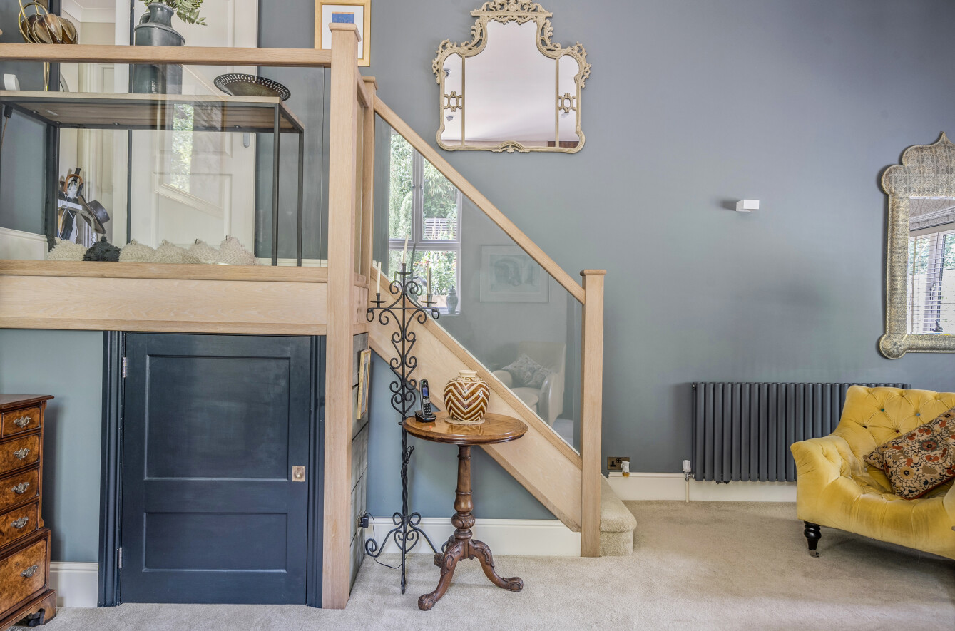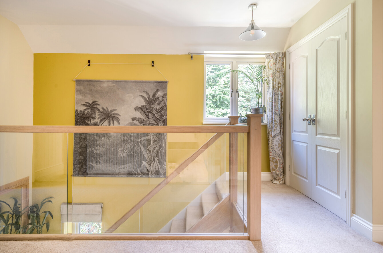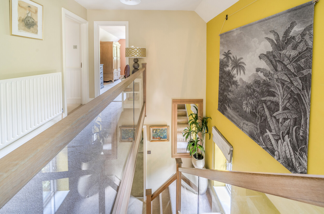 The stairs and 1st floor landing feature a glass and Oak balustrade allowing natural light from the window to infuse all areas.