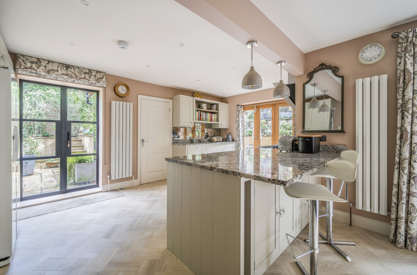 A high quality Neptune kitchen offers a fantastic range of deep drawer and cupboard storage including a fitted larder. These are topped by granite work tops which extend into a useful breakfast bar. Space for appliances has been well provided and includes an integrated dishwasher and microwave. There are south facing bi-folding doors onto the rear garden as well as casement doors onto the side garden.