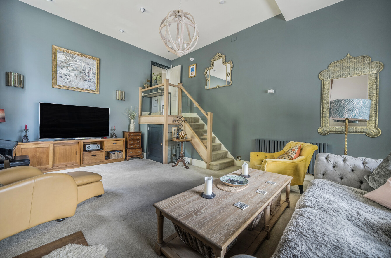 A door by the bottom of the stairs opens to reveal a magnificent sitting room with Stovax wood burner and a double height ceiling, a perfect retreat for escaping busy family life, to relax in peace and tranquillity. It's also the perfect room for Christmas, due to the high ceilings you can get the biggest Christmas tree your heart desires!