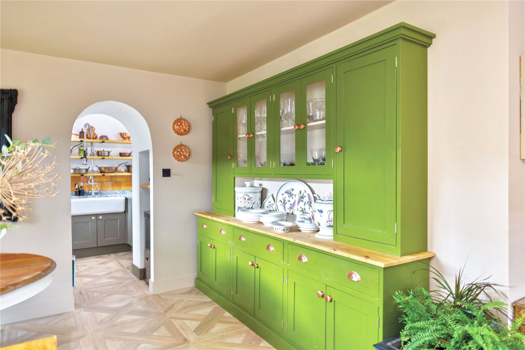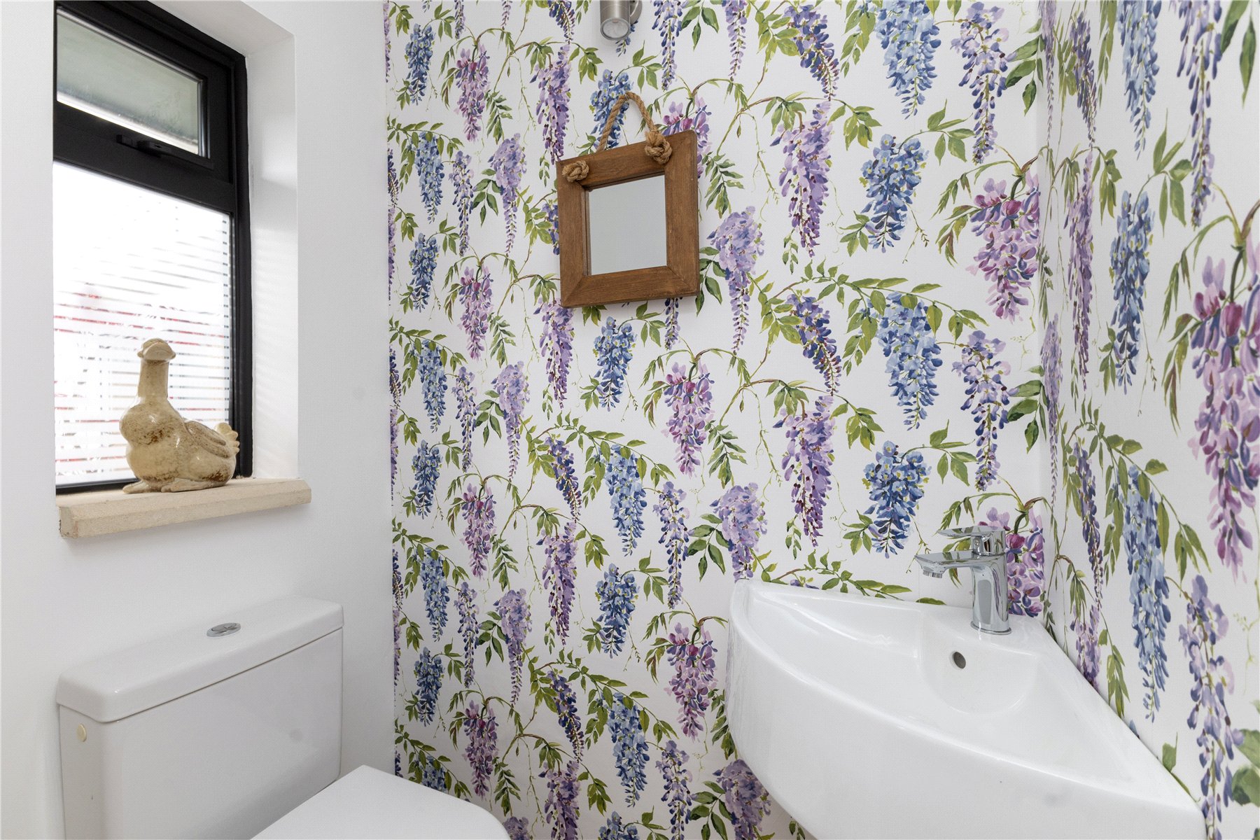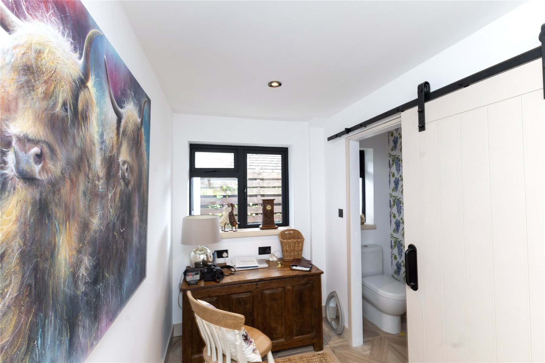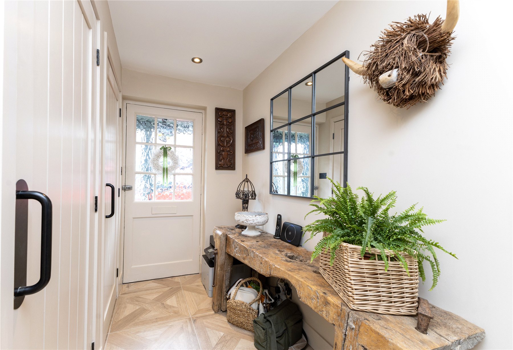 The front door is tucked away around the side and opens into a welcoming hallway with two deep storage cupboards
