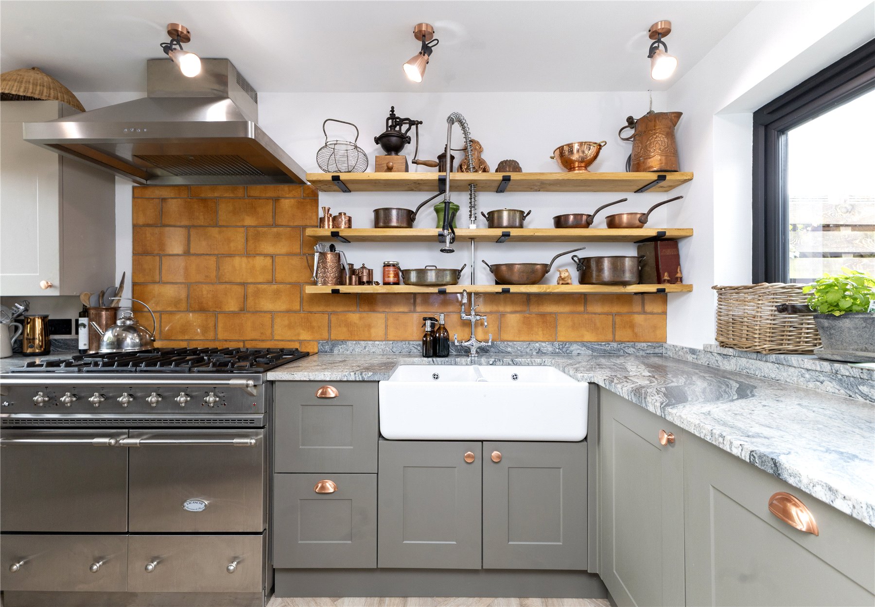 Contemporary fitted kitchen with granite worktops, a range of built in storage, twin sink, integrated dishwasher and space for further white goods